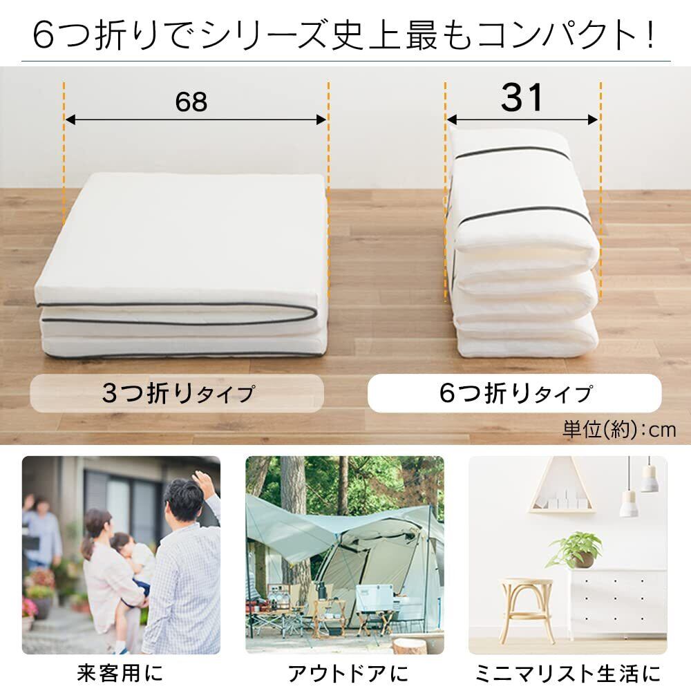 商品サイズ(cm):幅約95×奥行約198×高さ約5[シングル]<br>コンパクトに収納できる6つ折りマットレス。<br>多くの方に選ばれているエアリーシリーズが、快適な眠りと朝の目覚めをご提供します。<br><br>未使用時はコンパクトに収納。
