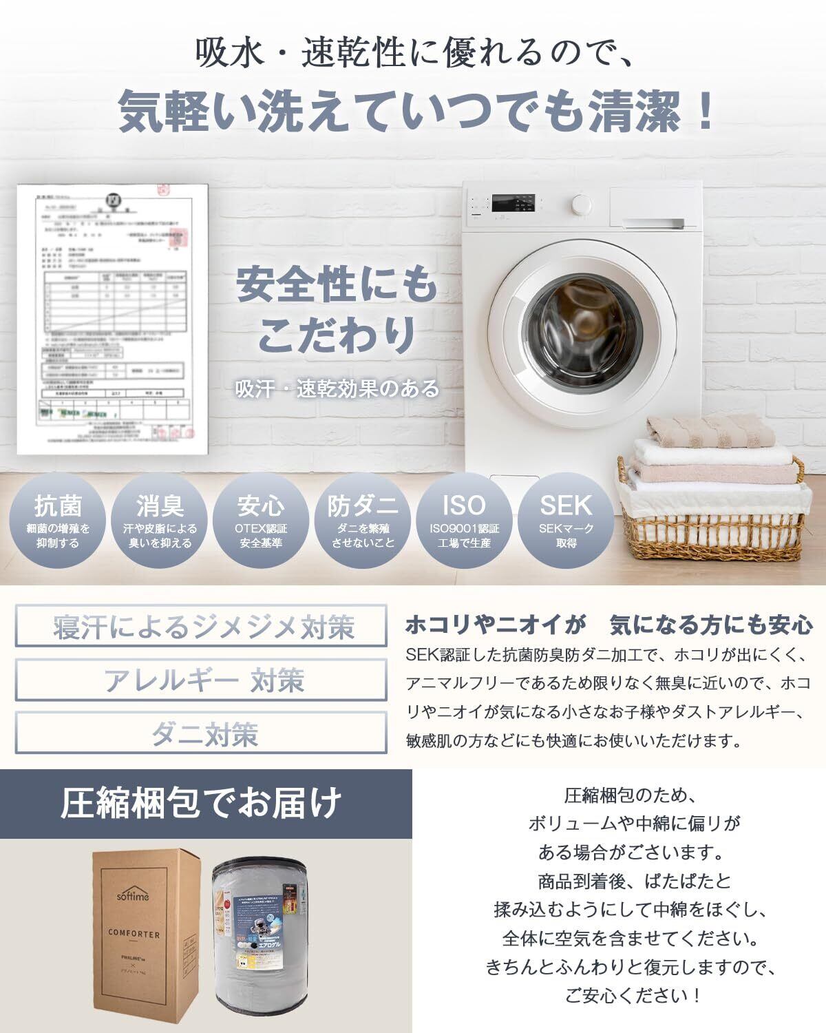 【ホコリが出にくい!アレルギーの方も安心】ホコリの量は羽毛布団の約1/14と少なく、徹底洗浄により衛生的です。敏感肌の方やお子様にも安心してお使いいただけます。【SEK認証·抗菌防臭防ダニ加工】ダニを寄せ付けにくく、優れた抗菌防臭効果で細菌の増殖や汗の臭いを抑制します。羽毛独特のニオイが苦手な方にもおすすめです。
