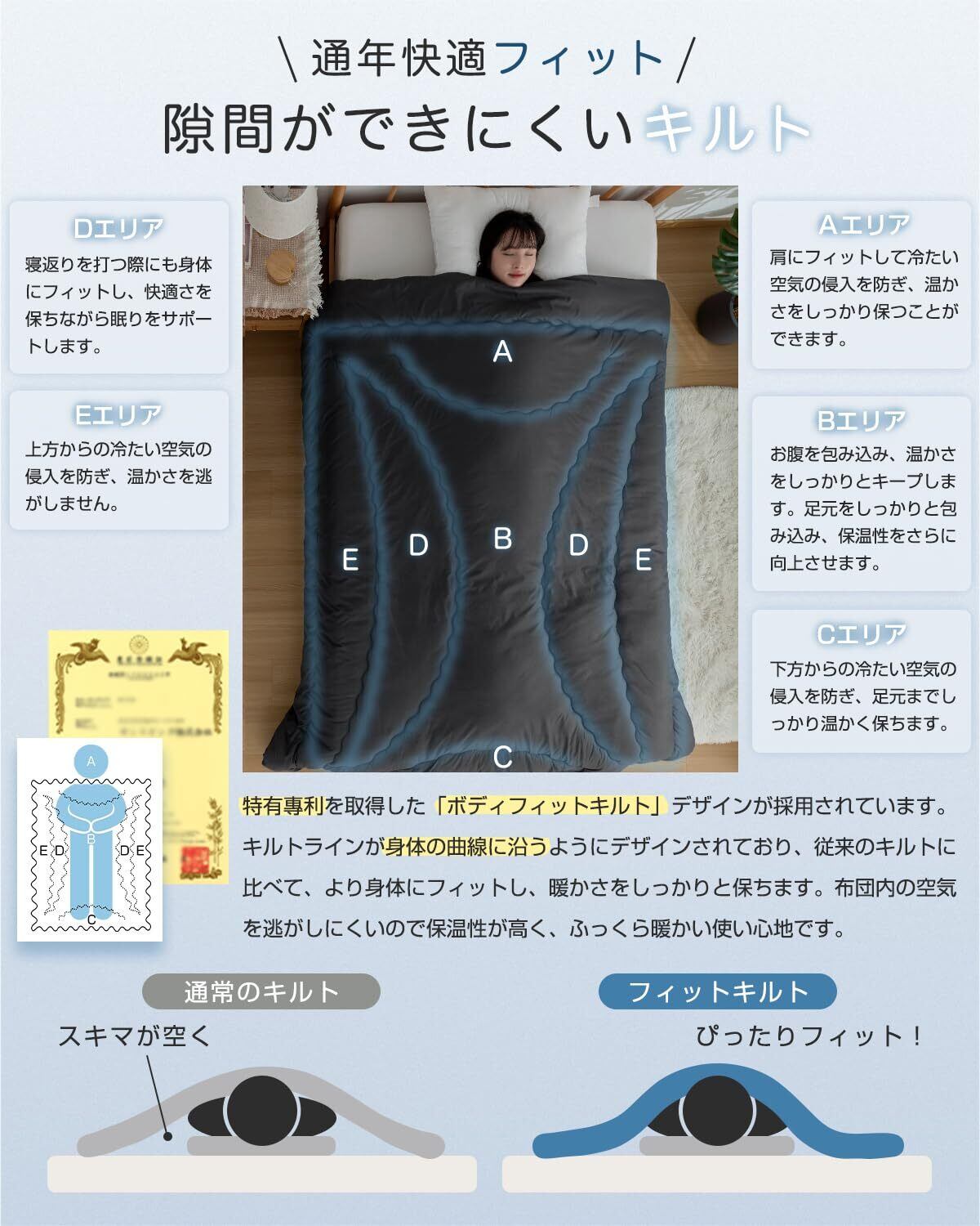 【体にフィットするキルト】人間工学に基づいたキルトデザインで、従来のキルトよりもさらに身体にしっかりフィット!寝返りしてもズレにくく、ぴったりとフィットするため、暖かさをしっかりキープします。