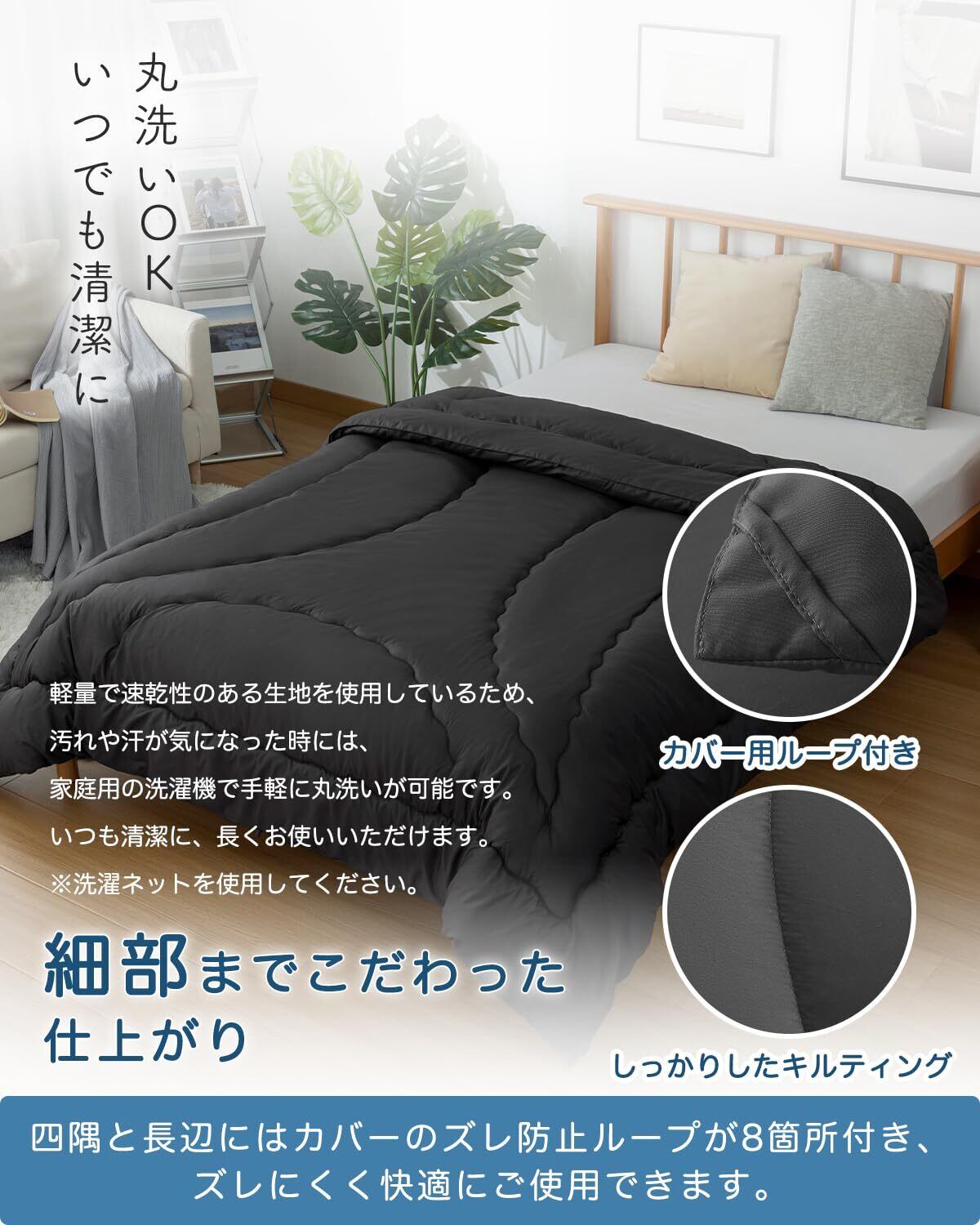 【オールシーズン掛け布団・商品仕様】「サイズ」シングル:150×210cm 「重量」約1.5kg「側地」ポリエステル100% (ピーチスキン加工)「詰め物」中空ポリエステル綿100%(重量:約1.0kg) 裏地:ポリエステル100%「ループ」8ヶ所 「企画国」日本【ご注意】お客様のご覧いただく環境により、色合いなどが異なる場合があります。実物とは色合いや明るさなどに相違が生じる可能性があるため、ご了承ください。万が一商品に不具合がある場合は、にご連絡いただければ迅速に対応いたしますので、ご安心してお買い求めください。