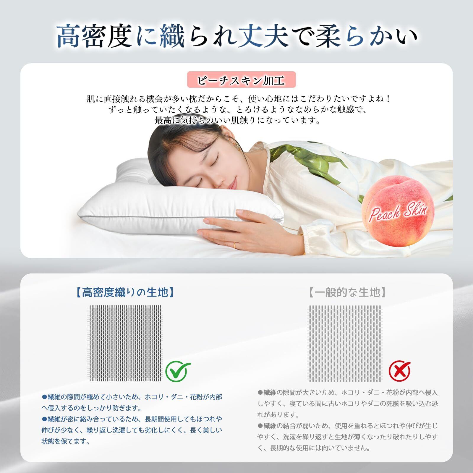 【ふわふわの柔らかい質感】ふわふわで羽毛のような触感のマイクロファイバー綿を採用しています。柔らかくふっくらとした触感に加え、良好な耐圧性を備えているため、形が崩れにくく、長くふっくらと快適な状態を保ちます。また、高弾力の綿を使用しているため底つき感がなく、しっかりとサポートします。軽さと柔らかさを兼ね備え、弾力性と復元力が高いことから、快適な睡眠をサポートします。