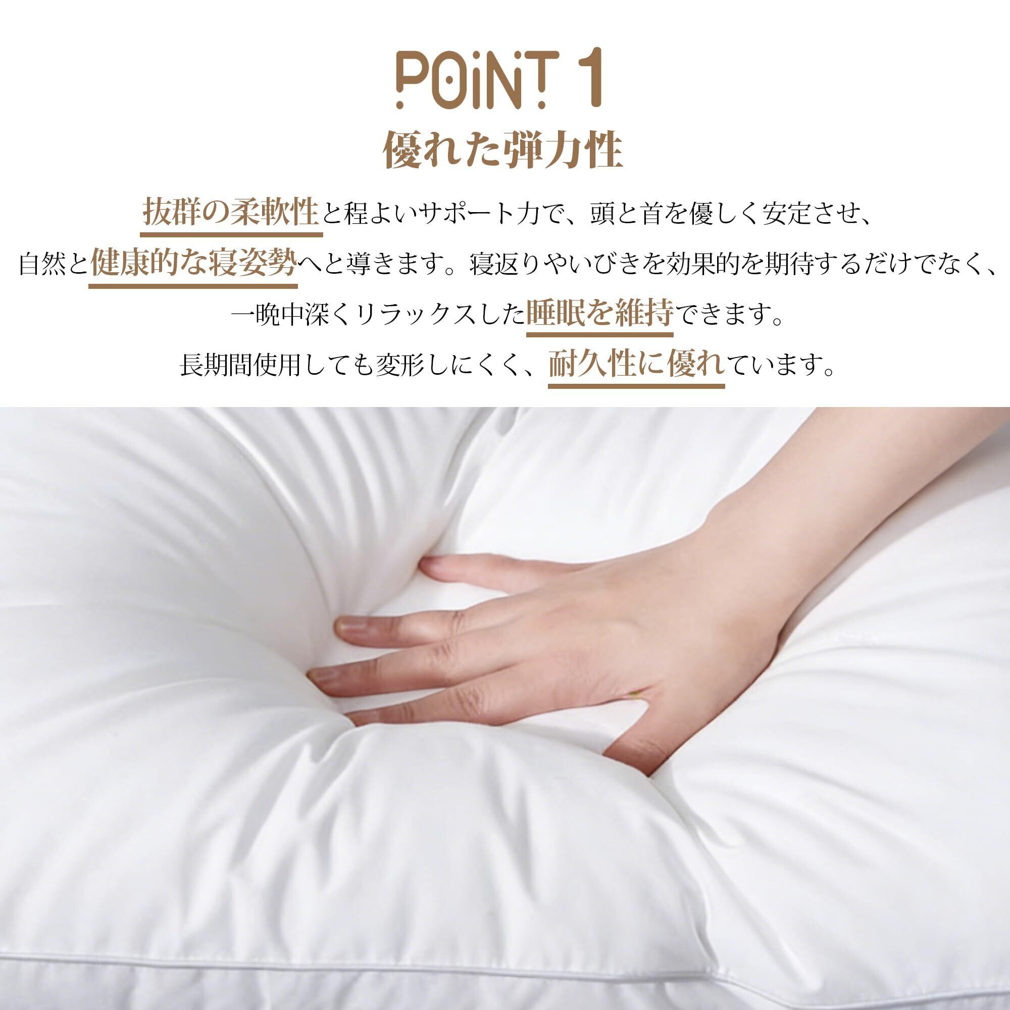 【高級ホテル仕様枕】 高密度ポリエステル繊維を使用し、優れた弾力性とサポート力を実現した枕です。サイズは63×43×20cm、重さは約1.1kg。ボリュームがありながらもかさばらず、快適さと安定したサポート力のバランスが取れています。