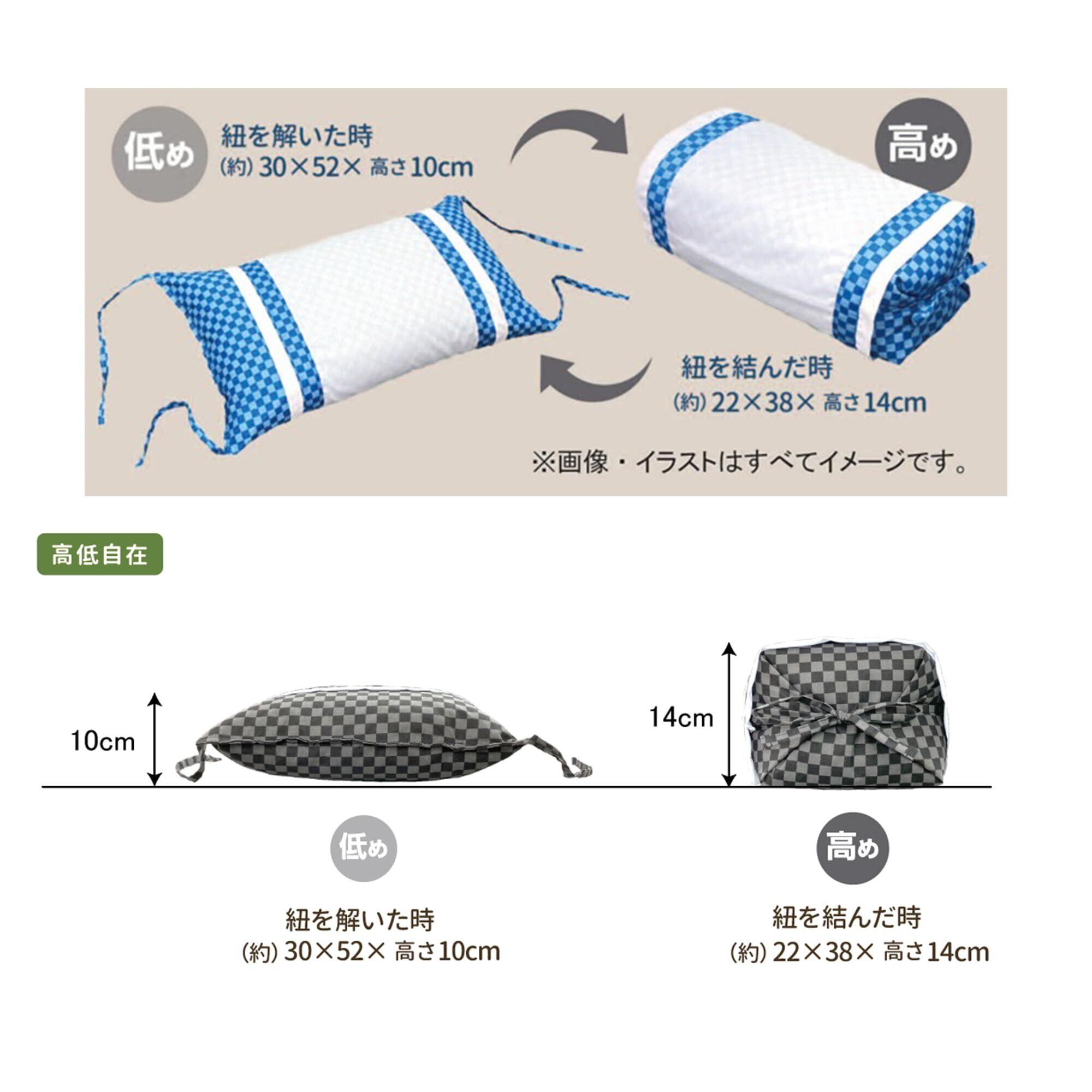 【サイズ】低め/約30x52x10cm、高め/約22x32x14cm、【材質】詰め物/そば殻、筒型カバー・枕本体・側生地/ポリエステル65%・綿35%、【生産国】そば殻生産・詰め加工・最終加工/日本(新潟県見附市)(生地のみ中国)