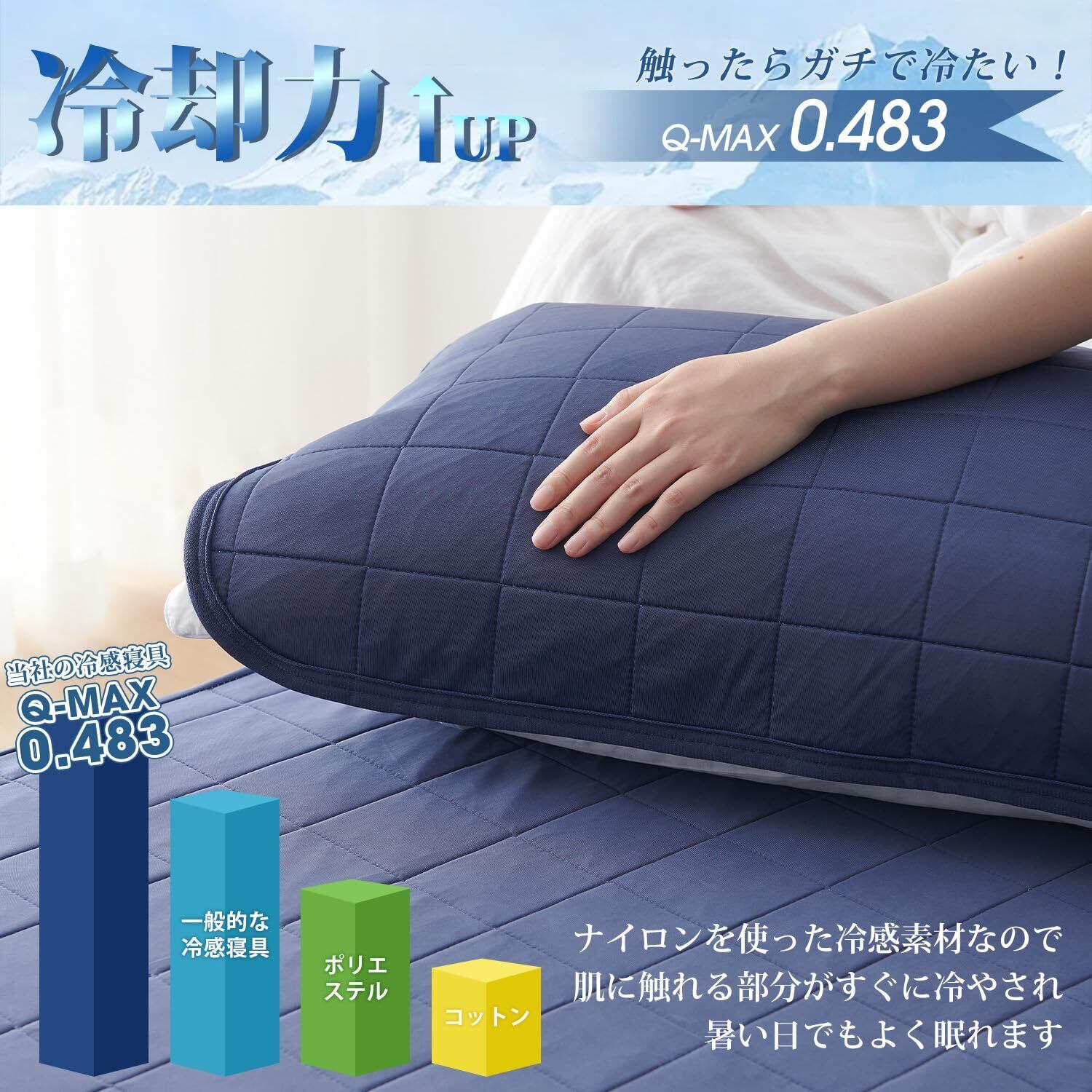 「ひんやり・すべすべ」表生地は毛玉になりにくいナイロンを使用した冷感生地です。Q-max値は0.483という高数値を記録した快適な冷たさで、寝返りを打つたびに「ひんやり感」が味わえます。クーラーと併用して使うとより効果を感じることができます。