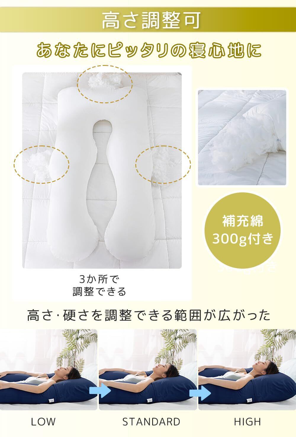【高さ・硬さを自由に調整可能】頭部と両サイドに3箇所の調整用ファスナー付き。付属の補充綿300gで、中身を増減しながらお好みの高さや硬さに簡単にカスタマイズできます。