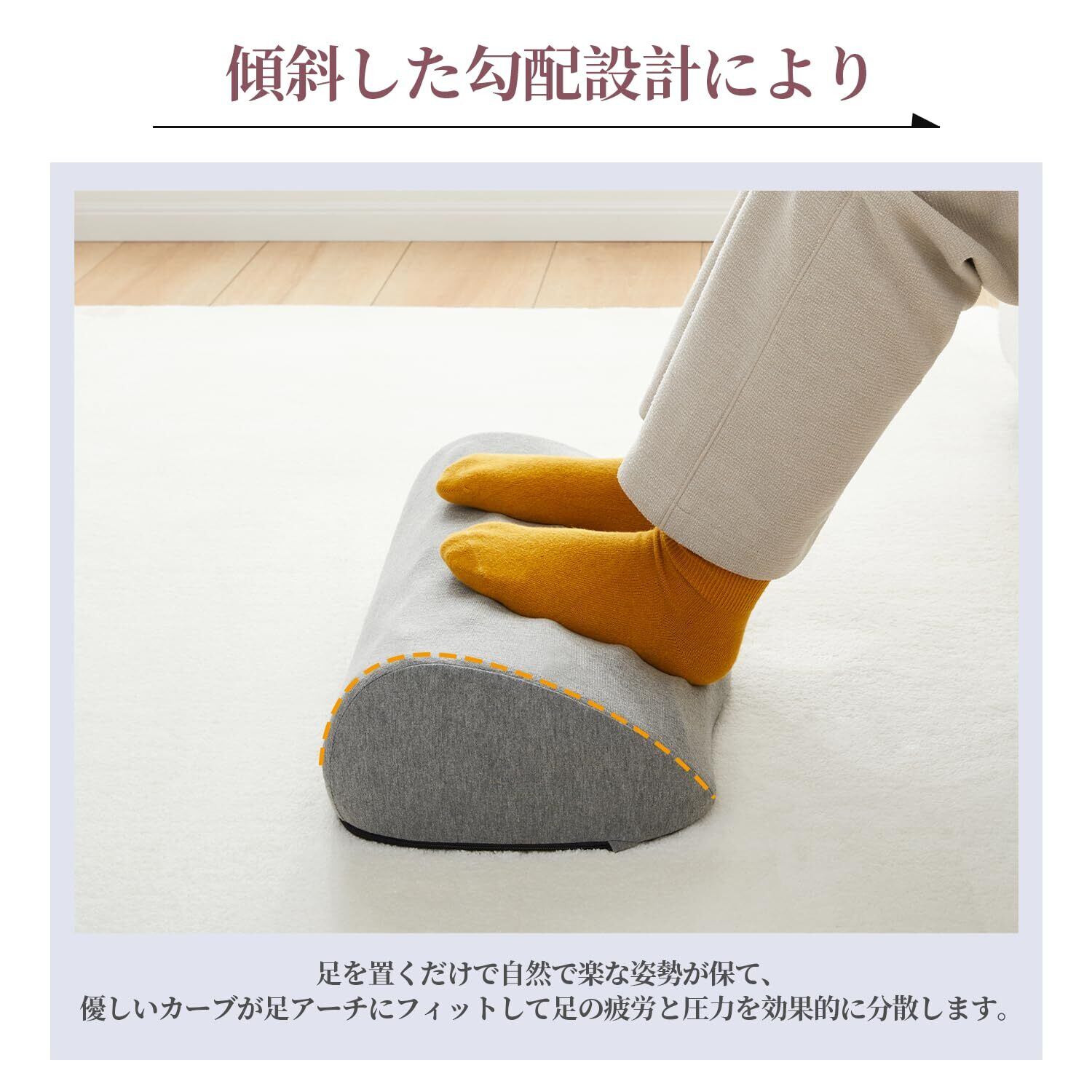 【アーチフィットカーブデザイン】超硬度メモリーフォームにより、足をしっかり支えます。傾斜斜面設計により、足を乗せるだけで自然で快適な姿勢を無理なく維持できます。緩やかな曲線が足のアーチ(土踏まず)にぴったりフィットし、足の疲労と圧力を効果的に分散させます。