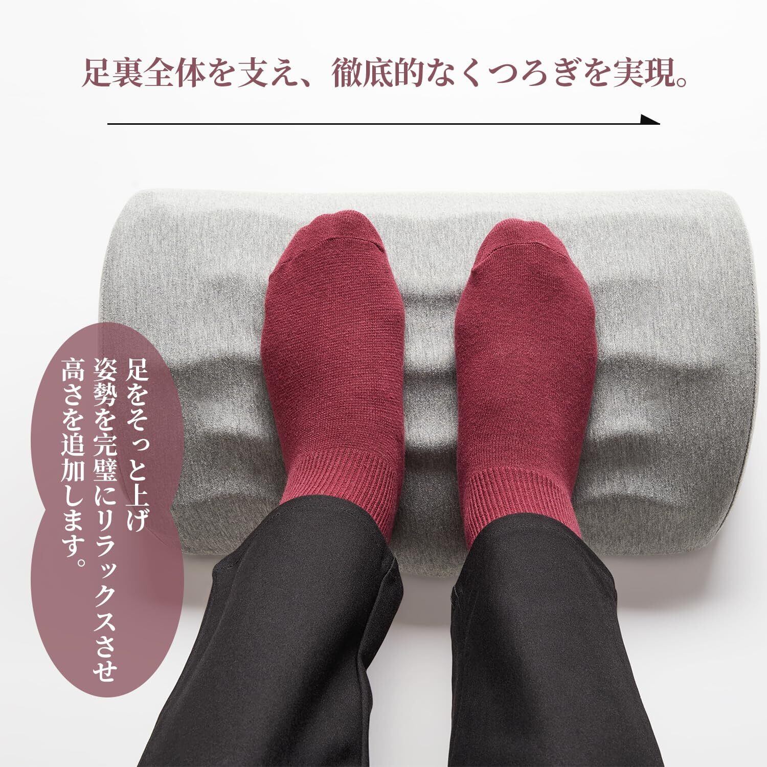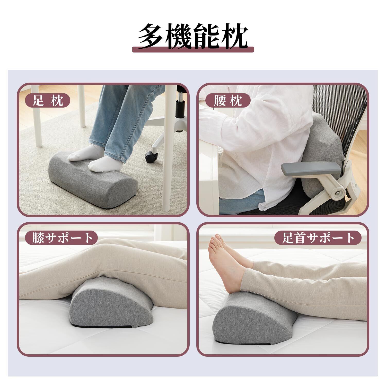 【多用途性】長さ43cm x 幅26cmサイズで、コンパクトな省スペースデザインです。足の緊張を和らげるだけでなく、腰サポート、膝クッション、ふくらはぎリラクサーとしても使えます。パソコン仕事、読書、テレビ視聴など、様々な場面で安全かつ快適に使えます。