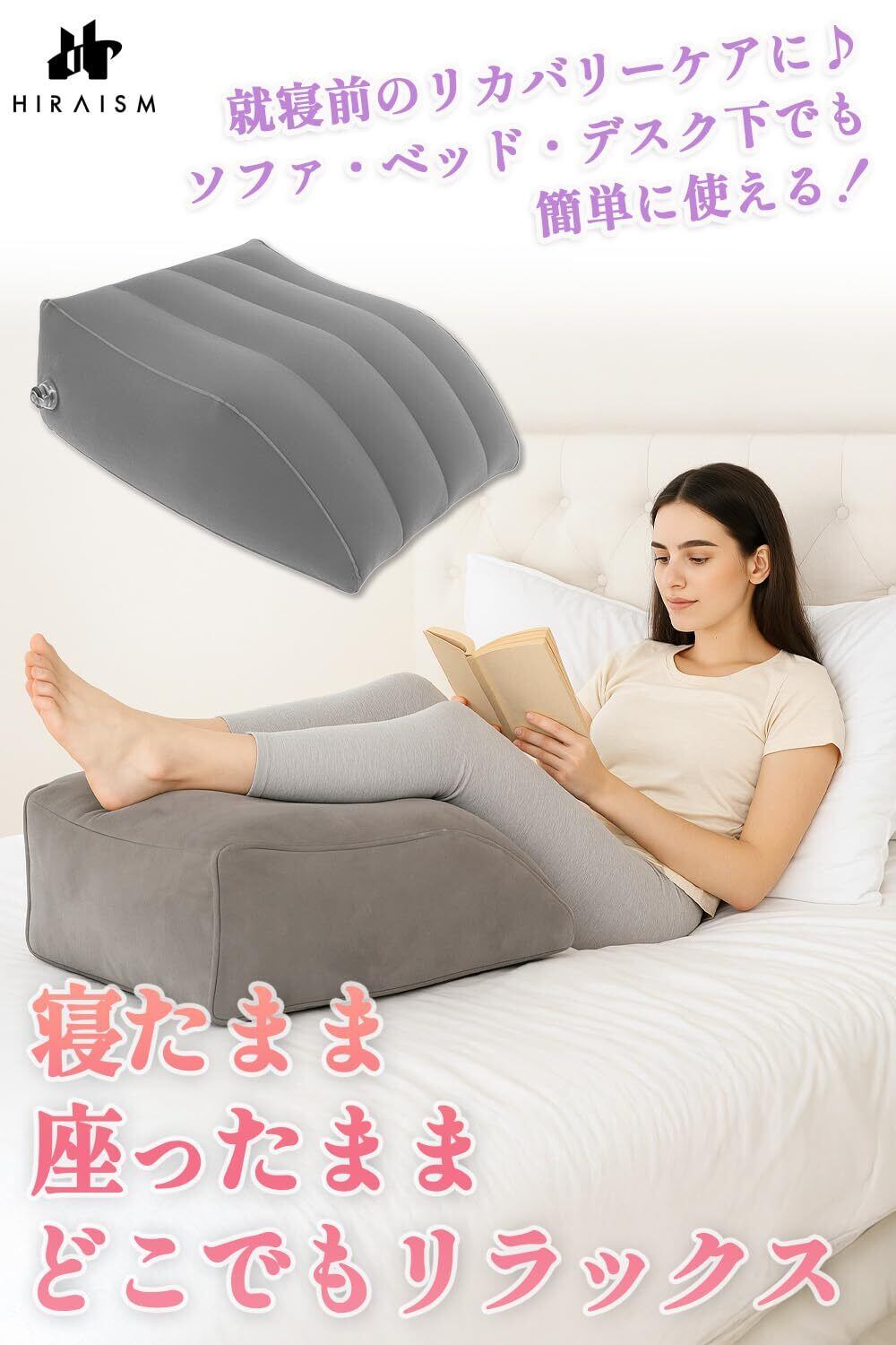 【好みの高さに調整できる柔らかエアー設計】空気量で高さと硬さを自在にカスタマイズ可能。高品質PVCに植毛(フロック)加工を施した表面は、しっとりとしたスエードのような肌触りで、長時間使ってもムレず快適。脚全体を包み込むように支え、膝下やふくらはぎの負担を和らげながら深いリラックスへ導きます。