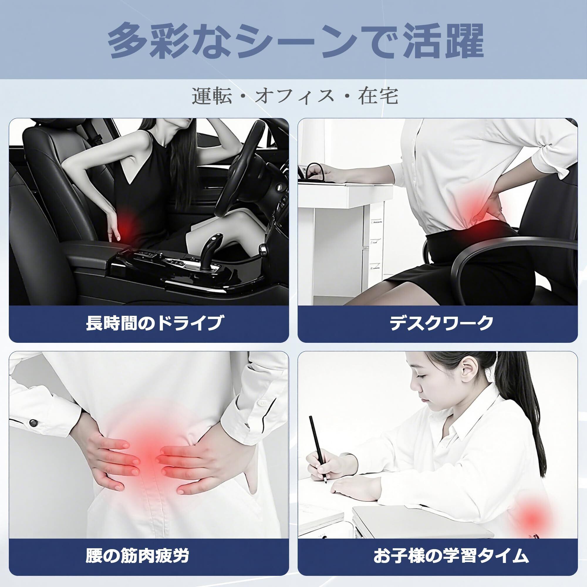 【様々なシーンで大活躍】自宅・オフィス・車内・学習チェア・車椅子など、さまざまなシーンで使える万能タイプです。軽量で持ち運びしやすいため、車用腰クッションとしての使用にも最適です。シンプルで落ち着いたカラーがインテリアに自然に馴染み、在宅ワーク、テレワーク、長距離ドライブなど幅広い場面で快適な座り心地をサポート。