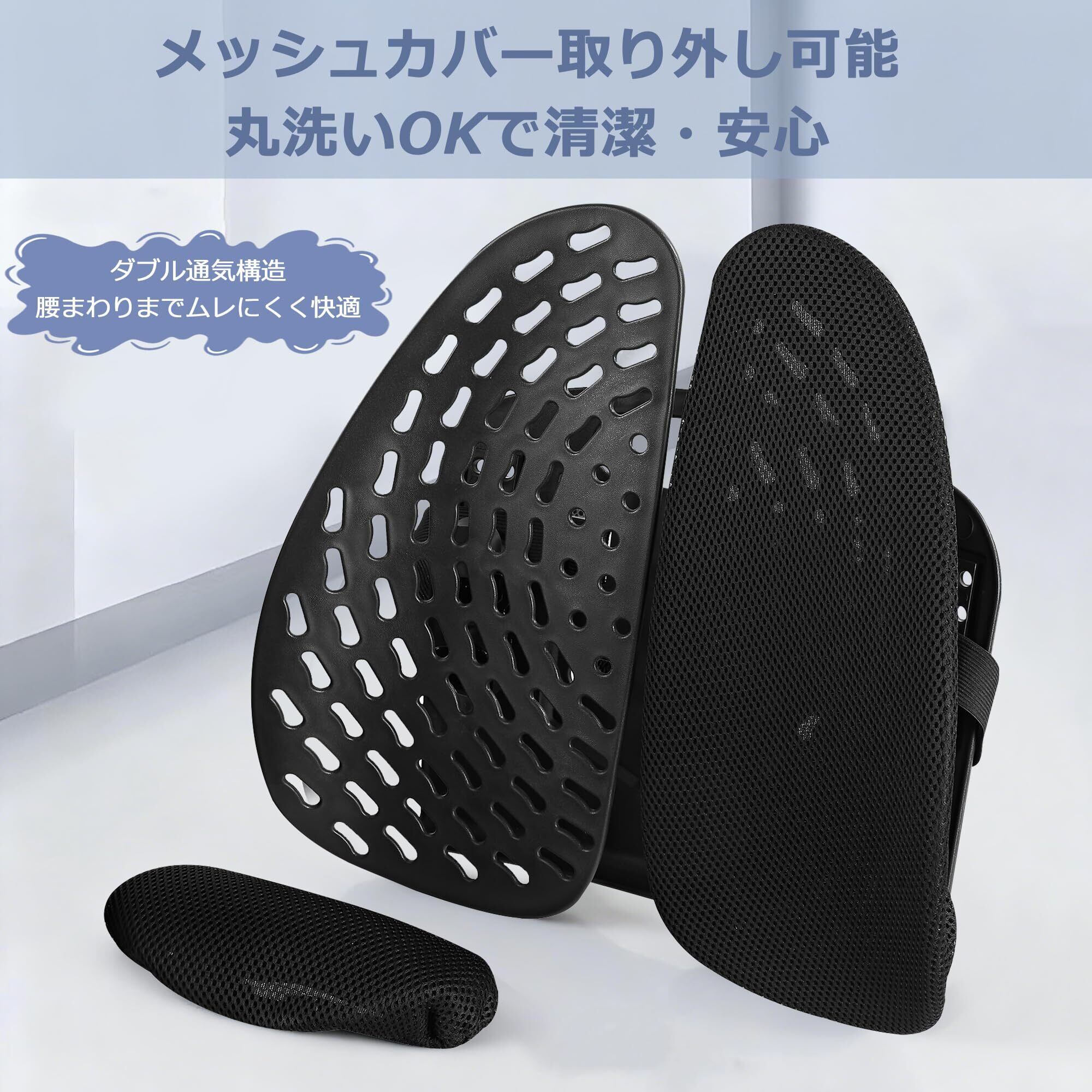 本製品は骨盤を立体的に支える二枚翼構造を採用した腰クッションです。幅2段階・高さ5段階の調整ができ、体型や椅子に合わせて快適にフィットします。通気性メッシュ素材により、長時間のデスクワークや運転でも蒸れにくく快適です。取り外し可能なカバーは洗濯でき、いつでも清潔に保てます。オフィス、自宅、車内、車椅子など様々なシーンでご使用いただける腰クッションです。