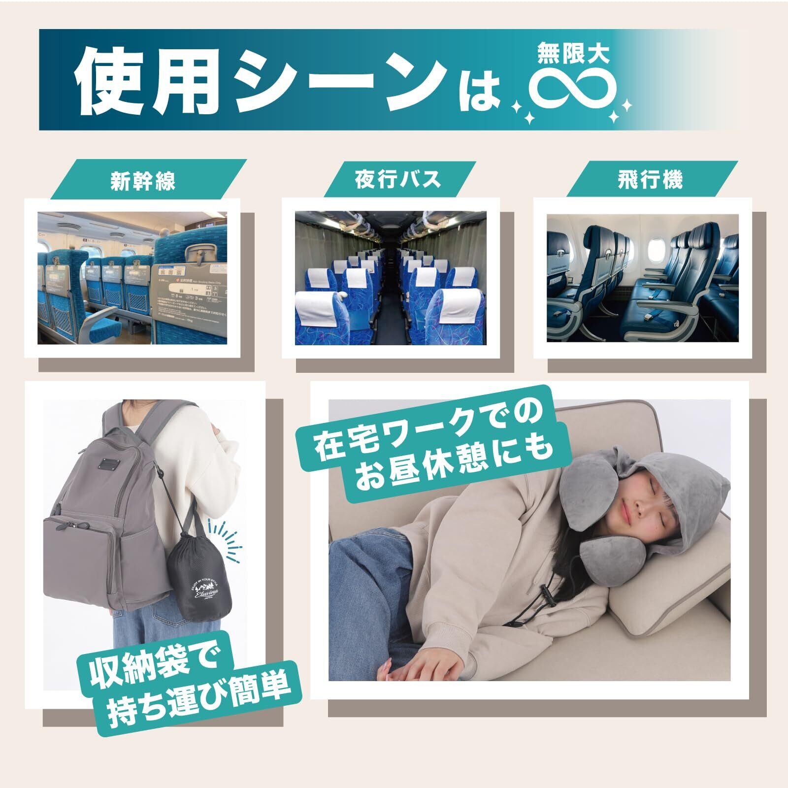 【コンパクト収納&便利な3点セット付き】 専用の収納袋でコンパクトに持ち運びOK!さらに耳栓・アイマスク付きで移動中の快適さをアップ。飛行機・新幹線・バス・車・オフィスなど、あらゆるシーンで活躍します。