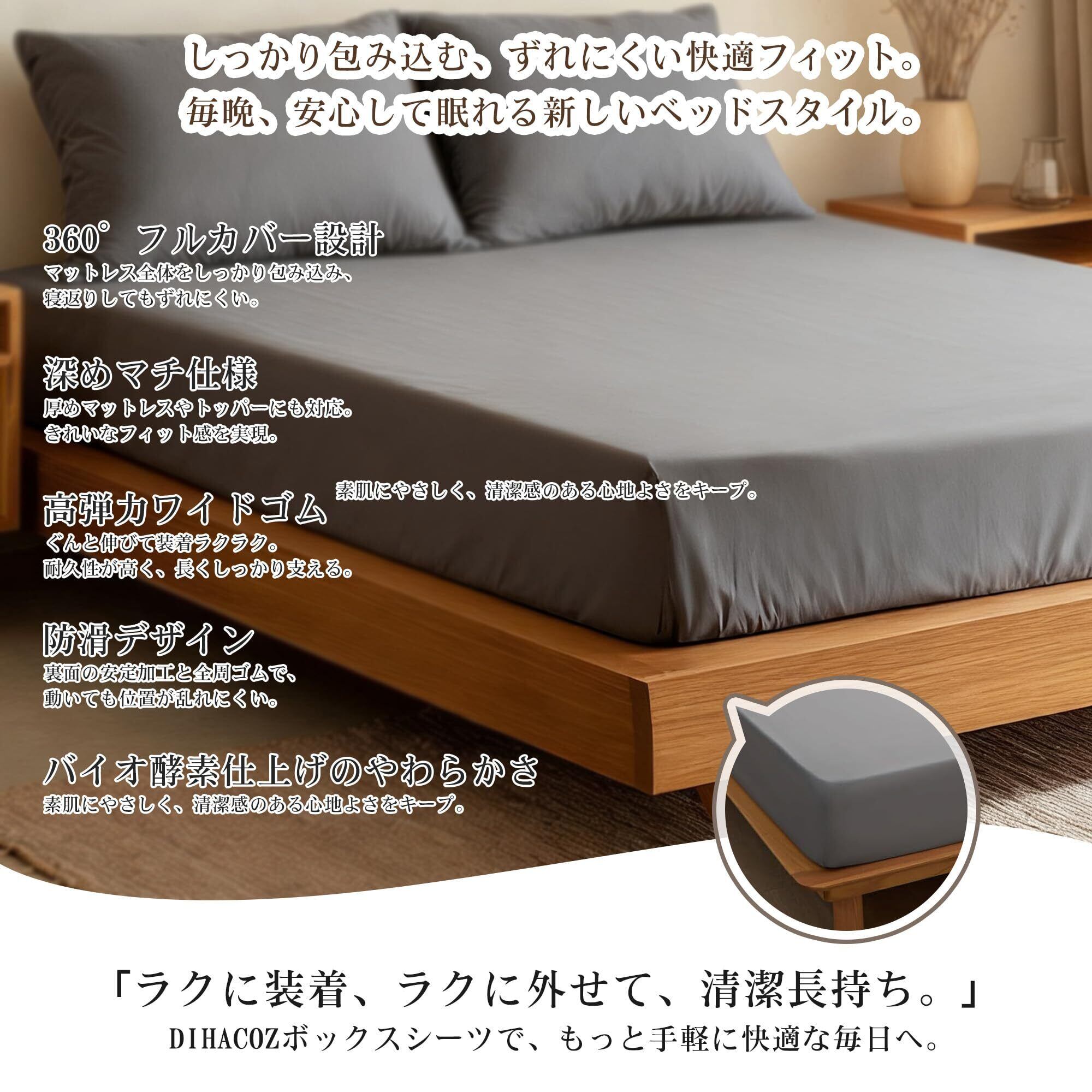 DIHACOZ ボックスシーツは、「バイオ酵素×超やわらか仕上げ」によって生まれた特別な肌ざわりが特長です。繊維表面の余分な毛羽を取り除き、毛玉やゴワつきを防ぐことで、まるで高級ホテルのシーツのようになめらかで贅沢な寝心地を実現しました。素肌に直接触れても優しく、敏感肌の方やお子様にも安心してお使いいただけます。 さらに、高機能ポリエステルを高密度で織り上げることで、汗や湿気をすばやく吸収・発散。通気性と速乾性に優れ、夏はさらりと涼しく、冬は冷えを和らげながら快適にお休みいただけます。抗菌・防臭・防カビ加工を施しているため、イヤなニオイや菌の繁殖を防ぎ、一年を通して清潔で心地よい寝環境を保ちます。 シーツの周囲には360°全周ゴムを使用し、マットレスをしっかり固定。ズレにくく、着脱も簡単で、和式・洋式を問わず幅広いマットレスに対応可能です。耐久性も高く、洗濯を繰り返しても縮みにくく色落ちしにくいため、長く美しい状態をお楽しみいただけます。 日常のお手入れもとても簡単。ご家庭の洗濯機で丸洗いでき、乾きが早くシワになりにくいので、毎日の生活に寄り添う便利さを実感いただけます。さらに365日品質付きで、万が一の不具合やご不明点があればカスタマーサービスが迅速に対応。安心して長くご愛用いただけるボックスシーツです。