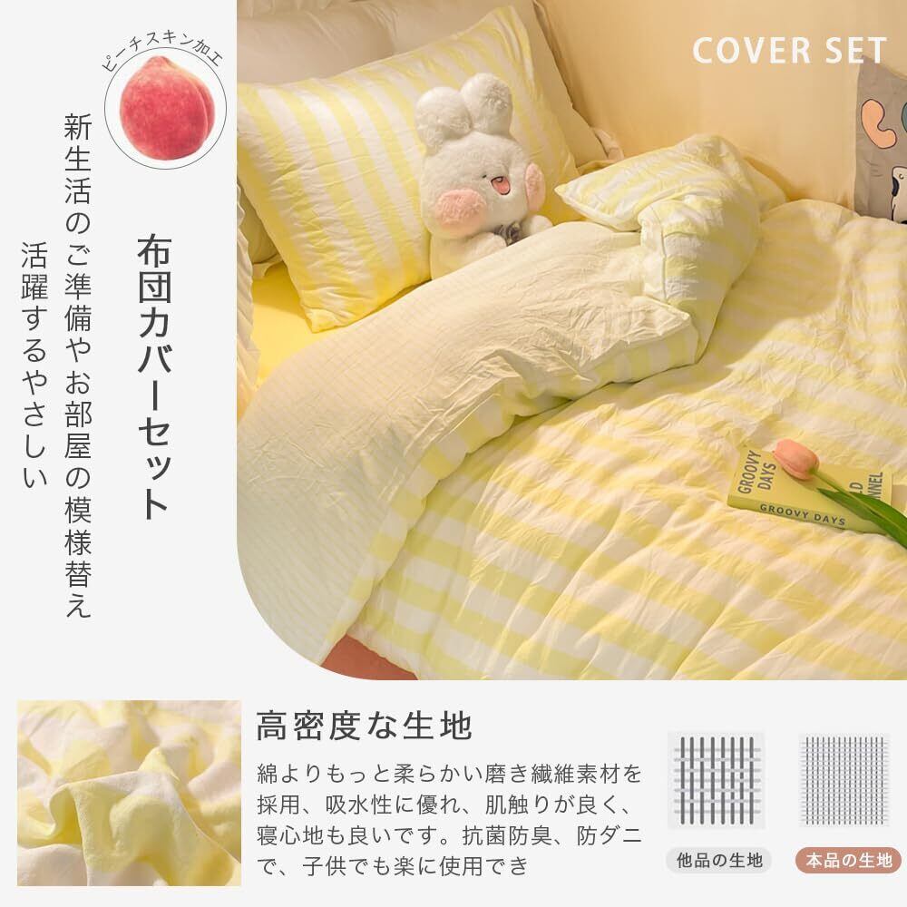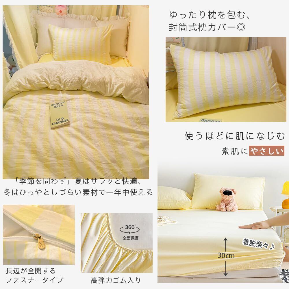 布団カバーセット insストライプ 両面使えるシンプル寝具カバー 洋式・和式兼用 シングル 3点セットセミダブル ダブル4点セットふとんカバー boxシーツ 寝具カバーセット ボックスシーツ ベッド用 敷き布団用 肌に優しい 柔らか 丸洗いOK 安心 清潔 (イエロー, シングル-3点セット)