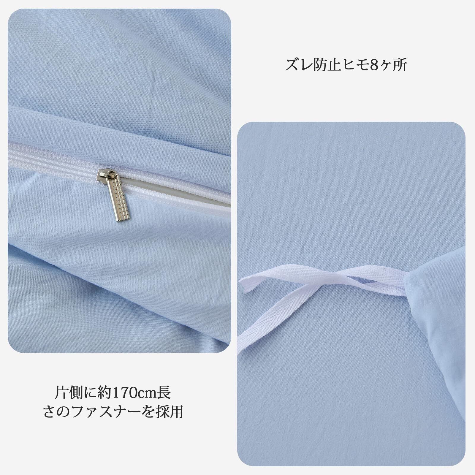 【布団カバーセット内容】:「掛け布団カバー・170x210cm(1枚)」:片側にファスナーを使用、布団留め紐8ヶ所付き。「ボックスシーツ・125X200+30cm(1枚)」:全周ズレ防止ゴム付き、通常サイズより大きめなので、高さ3-28cmの敷き布団とマットレスの底まで包むことが可能。「枕カバー・43X63cm(2枚)」:封筒式で出し入れが簡単です。