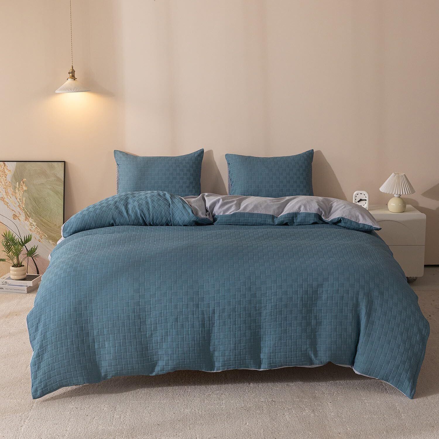 NOLAYA 布団カバー ダブル 4点セット 洋式・和式兼用 寝具カバーセット 掛け布団カバー ボックスシーツ 枕カバー ワッフル生地 防臭 肌に優しい 洗い替え 速乾 おしゃれ 北欧風 (ブルー)