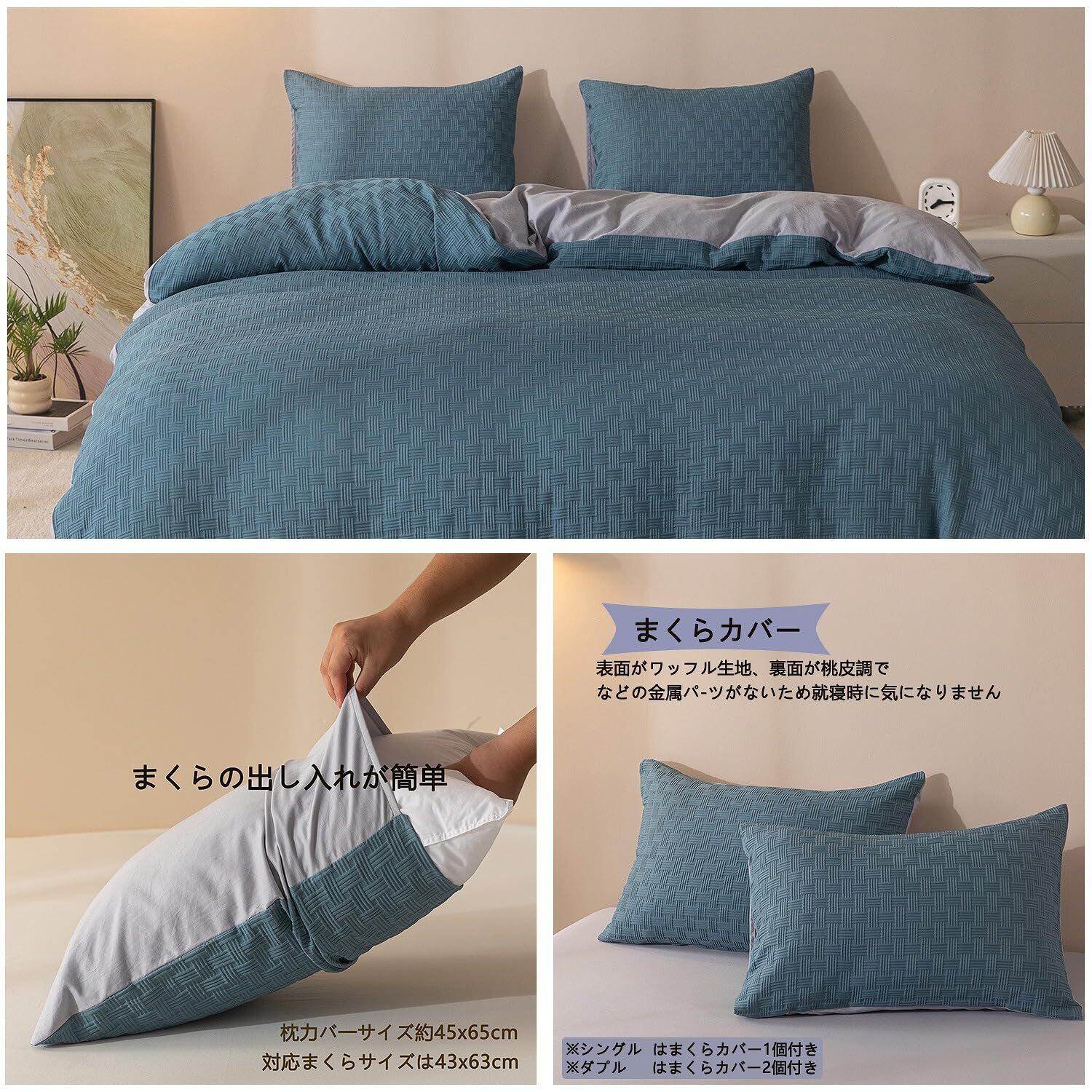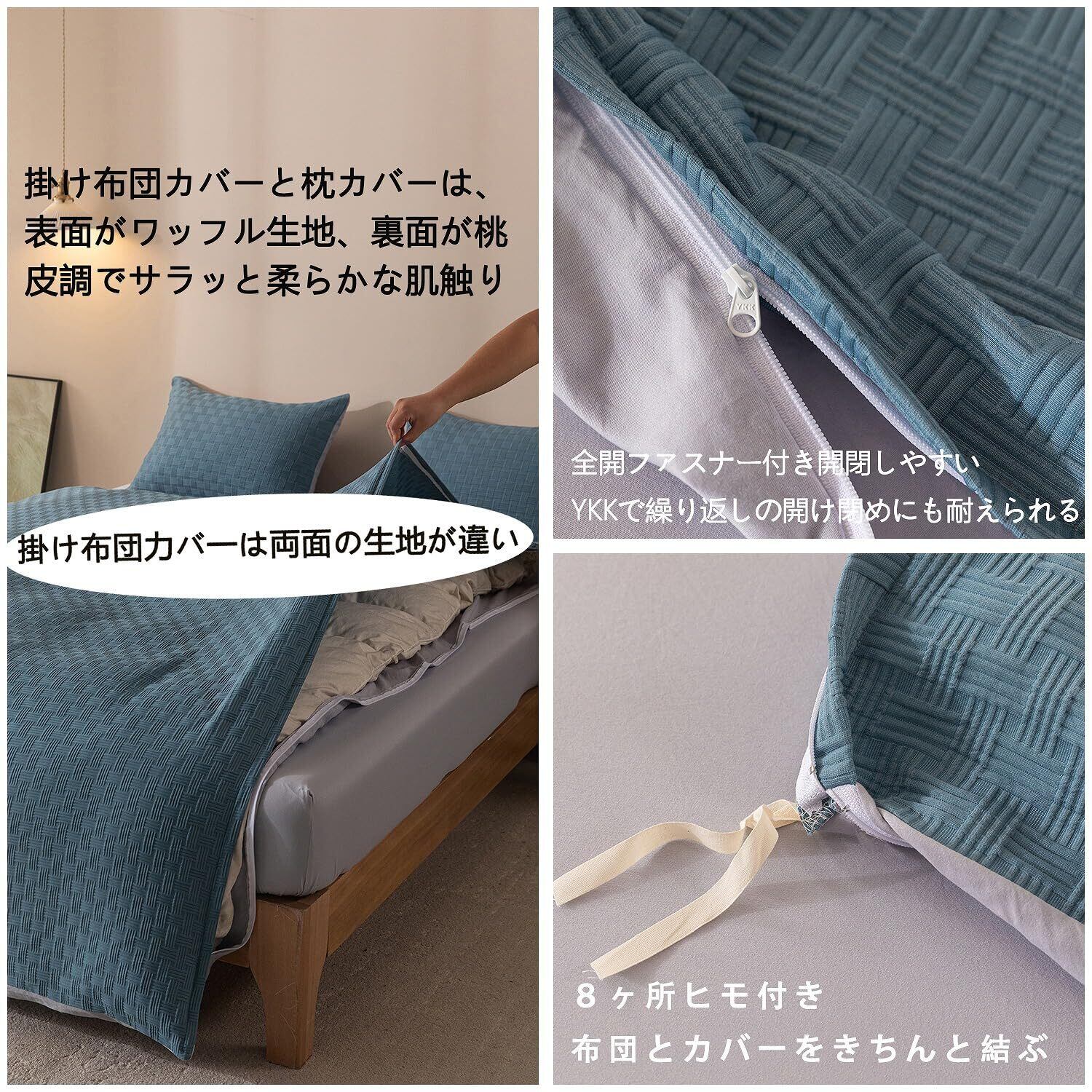 【ワッフル生地】素材:ポリエステル100%。掛け布団カバーと枕カバーは表面がワッフル生地、裏面が桃皮調でサラッと柔らかな肌触りで心地よくご利用いただけます。ボックスシーツは全面ピーチスキンを使用し、すっぽり被せるだけで着脱できて、寝相を気にすることなく眠れます。寝具カバーセットとして、四季を通じて快適な眠りをサポートします。