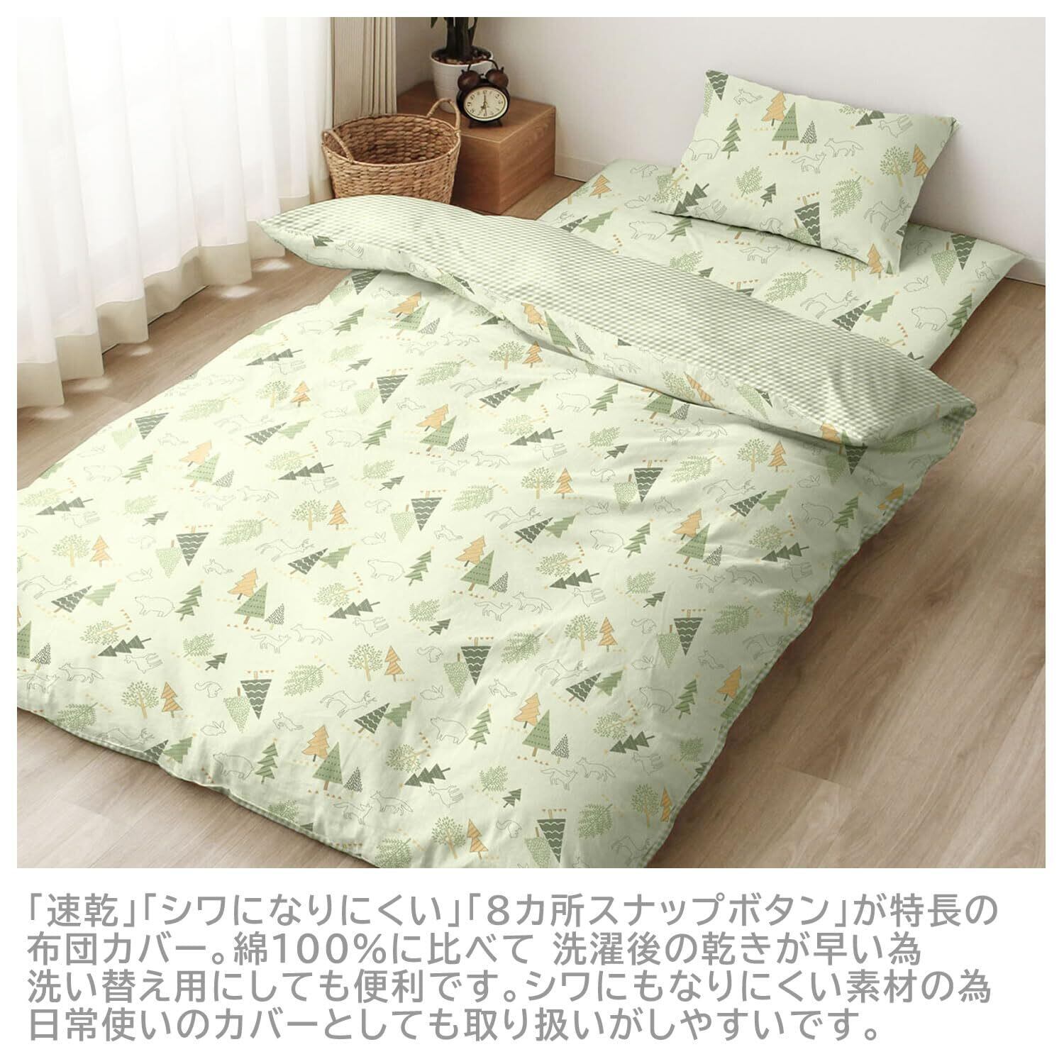 メリーナイト 掛布団カバー 「北欧ツリー/ギンガムチェック」 グリーン シングルロング 約150×210cm リバーシブル仕様 両面使える 内側スナップボタン8カ所付き 着脱簡単 綿混素材 速乾 シワになりにくい 洗える 衛生 清潔 オールシーズン MN12152-53
