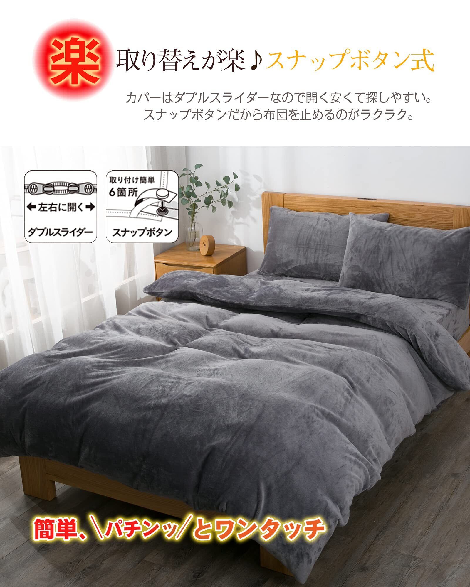 【お手入れ簡単】❶一般的なズレ防止紐の場合、一つ一つ結ぶ必要があり、非常に手間が掛かってしまいました。のふとんカバーはスナップボタン式となっているので、布団についているループに紐を通しパチンと止めるだけ!❷ ダブルファスナーでファスナーを両端から開閉出来る仕様を採用しますから着脱しやすい。❸【ご自宅で丸洗い可能】:洗濯耐久性に自信あり!ご自宅の洗濯機で丸洗い可能、いつでも清潔に使えます。面倒家事も短縮できます。