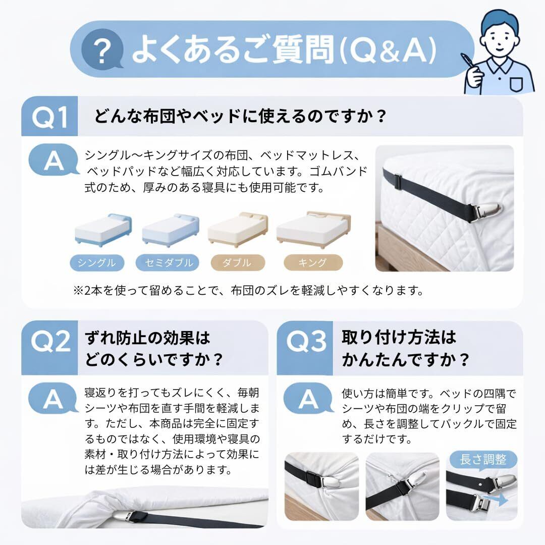 注意事項:本商品はシーツ固定用のゴムバンドです。シーツや布団、マットレスは付属しません。用途以外での使用や無理な引っ張りは破損の原因となります。