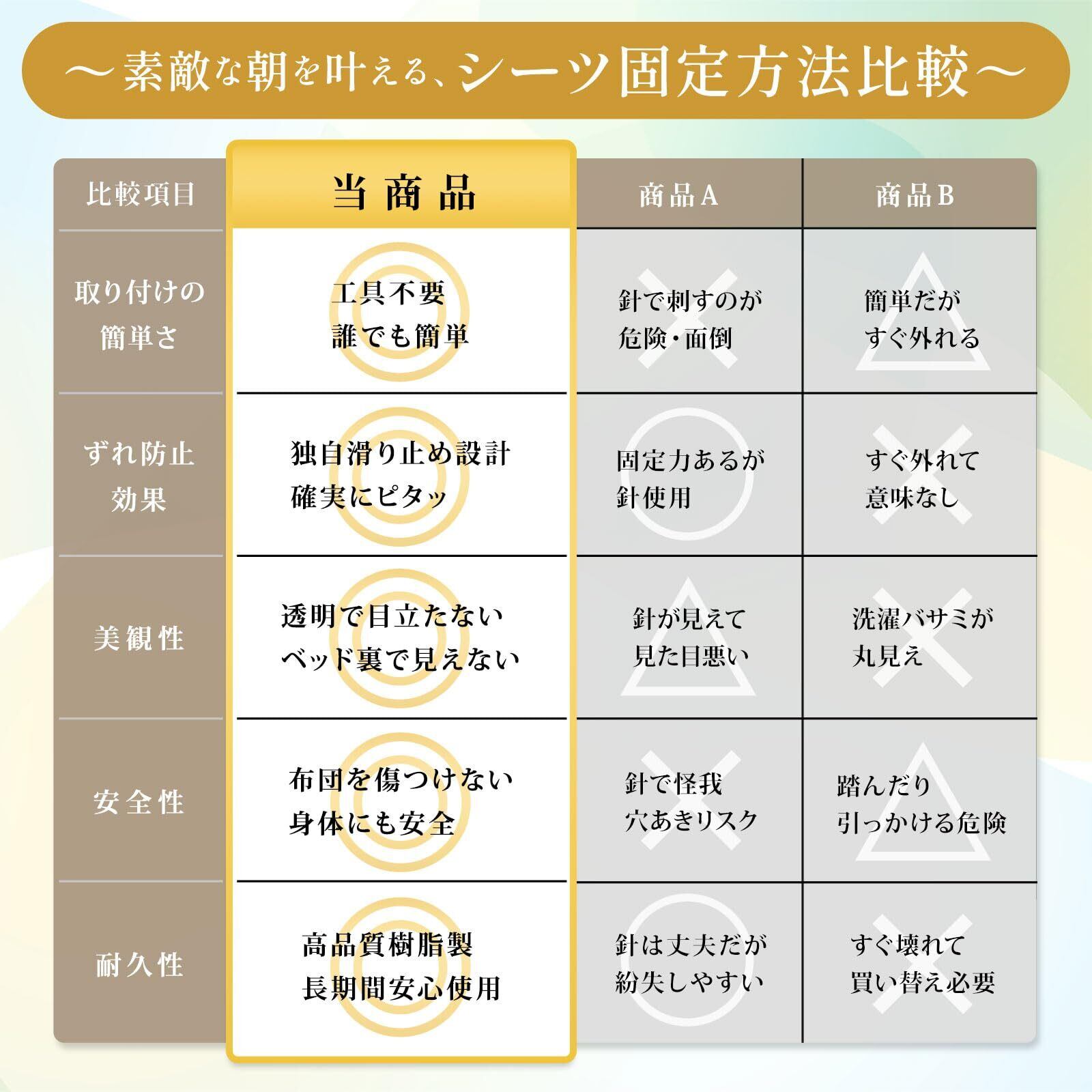 【簡単3分で変わる朝】 使い方はとってもシンプル。シーツの四隅にクリップを挟むだけで、あっという間に設置完了です。特別な道具も技術も必要ありません。初めて使う方でも迷うことなく、すぐにその良さを実感していただけます。独自の滑り止め構造が、あなたの寝返りにもお子様の元気な寝相にもしっかり対応。一度付けたら朝まで外れることはほとんどありません。洗濯の時も簡単に取り外せて、また次回すぐに使えます。慌ただしい朝も、ゆったりとした夜も、いつものベッドメイキングがぐんと楽になる。そんな日常の変化を、今夜から体験してみてください。