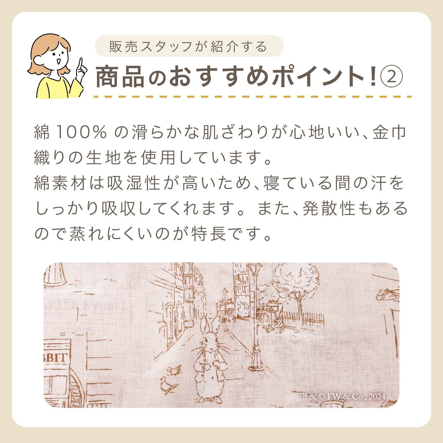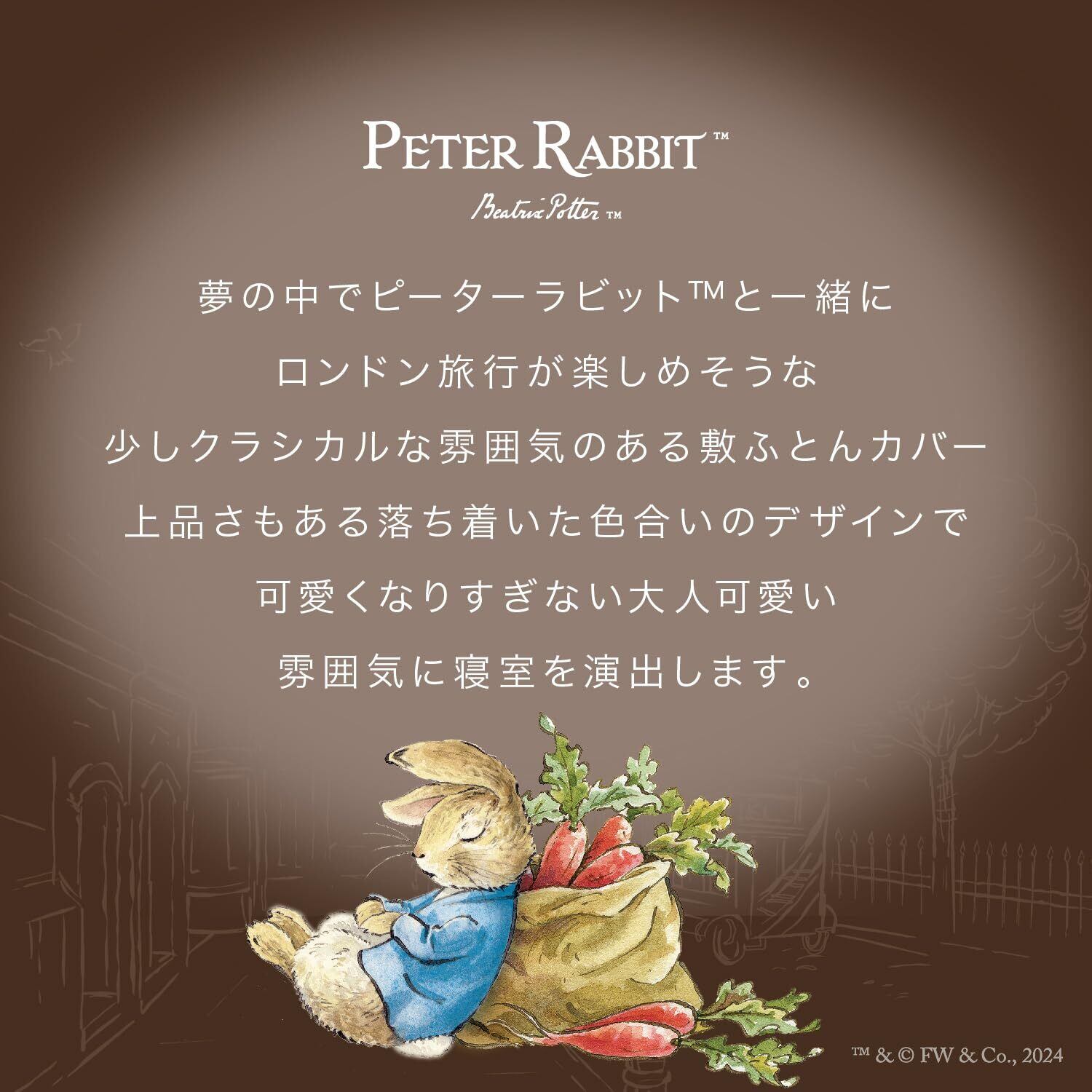 ピーターラビット(TM)柄の敷き布団カバー。ピーターがロンドンの街をお散歩している姿が描かれています。手書き風のタッチと淡いワントーンのカラーでまとめたカバーは、上品さと落ち着いた色合い、可愛くなりすぎない大人可愛い雰囲気に寝室を演出します。