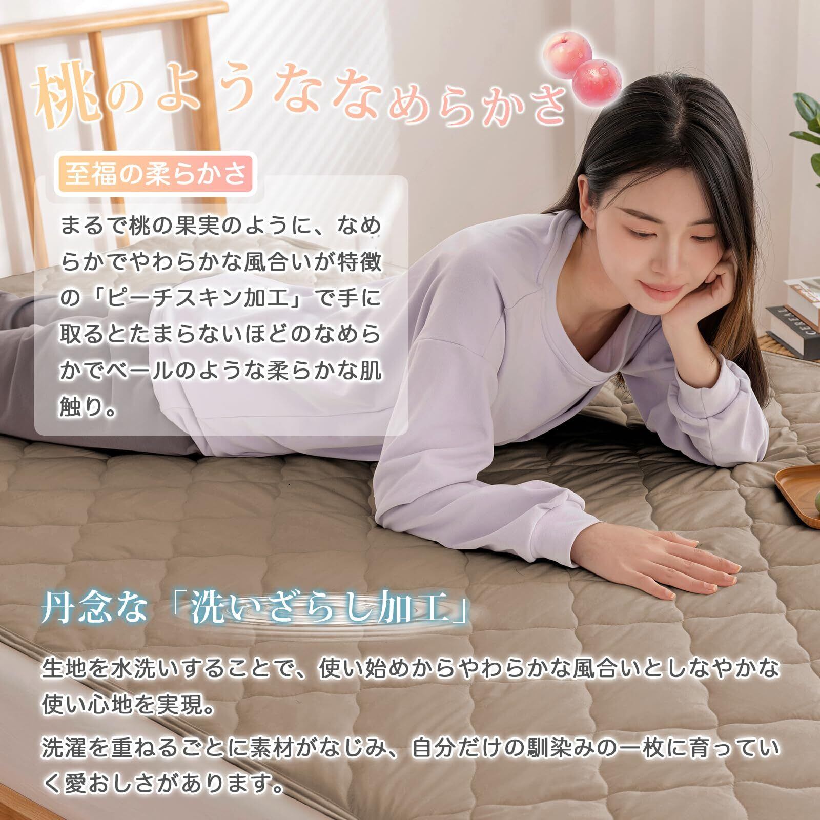 【驚くほど柔らかな肌触り】桃の皮のような薄起毛を施した「ピーチスキン加工」と「特殊な水洗い加工」を施すことで、生地に自然な柔らかさと心地よい風合いを持たせています。毛羽立ちや毛玉も発生しにくく、さらりとなめらかな肌触りで、極上の寝心地をお楽しみいただけます。
