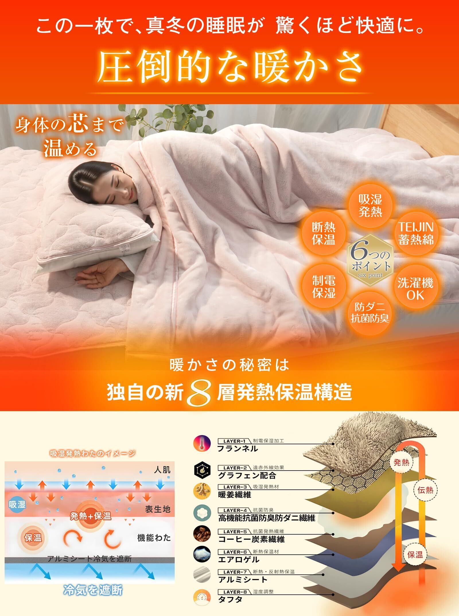 【一晩中持続する暖かさの秘密】は、こだわりぬいた独自の「新8層発熱保温断熱構造」です。①このあったか敷きパッドの表層には、驚くほどなめらかな肌触りのマイクロファイバーを使用、ふわっと素肌に触れるたびに、極上の気持ちよさにとろけてしまうほど。②生地基布に「遠赤外発熱」「熱伝導性」「蓄熱保温」「抗菌防臭」特性を備えている奇跡のグラフェン配合しています。③『贅沢に詰め込んだのは、特別な中わた』中わたの上層には、天然生姜成分配合の吸湿発熱新素材『暖姜繊維』と高機能抗菌防臭防ダニ繊維を採用しています。下層には「吸湿発熱」「蓄熱保温」「遠赤外発熱」「消臭」の特性を持ち、環境にも優しい素材『コーヒー炭素繊維』と次世代断熱材『エアロゲル』を採用。「吸湿発熱」×「遠赤外発熱」のわたが、寝ている間の汗を吸って暖かさに変え、しかもムレにくくなっているので、より保温性が高くなっています。④裏地には「冷気遮断」のアルミシートを使用し、敷パッドの下層部でつくられた熱を反射させ、外部からの冷気を遮断。圧倒的な暖かさを効率よく全体に伝えて循環させるから、真冬でも暖かさが保てます。