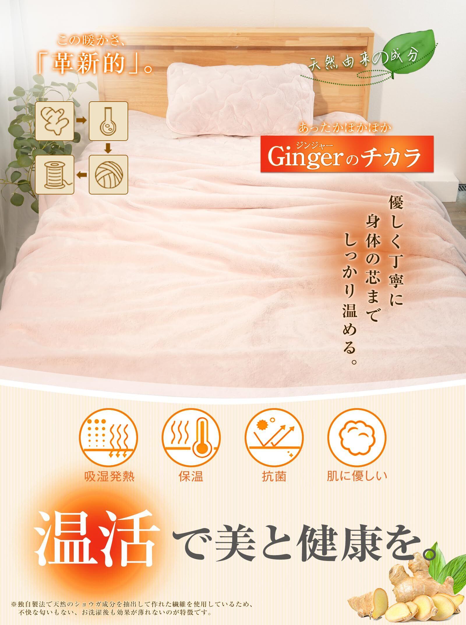 【極みジンジャーのチカラ&『温活』で美と健康を】体温が1℃下がると免疫力は約30%減弱すると言われます。「冷えは万病の元」と言われるように、体を温めることが大切です。『温活』とは、基礎体温を上げて体の不調を改善し、身体の調子を整える習慣のこと。天然由来のショウガ成分配合の『暖姜繊維』が天然の「吸湿発熱」「蓄熱保温」「天然抗菌」3つの特徴を持ち、体にも環境にもやさしい。当店新品の暖かい敷きパッドは、『温活』おすすめの極み生姜のちからで優しく丁寧に体の芯まで温めます。一晩中持続するあったかぽかぽか。この瞬温シリーズ冬用敷きパッドをセットで、お家でもオフィスでも気軽に『温活』。※独自製法で天然のショウガ成分を抽出して作れた繊維を使用しているため、不快な匂いもないし、お洗濯後も効果が薄れないのが特徴です。