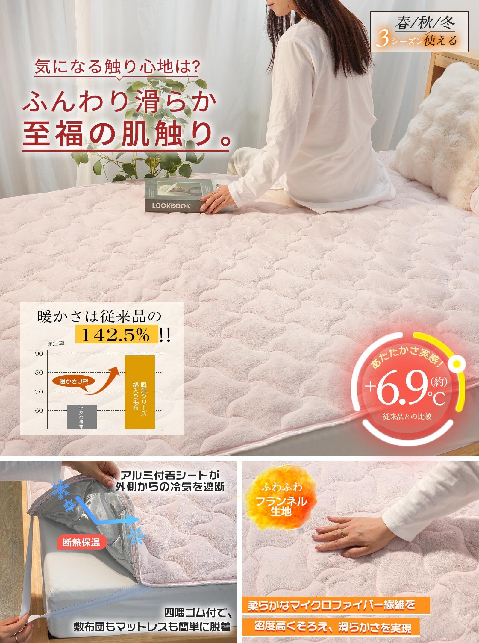【とろけるような肌触り、まるで雲の上で眠るような心地よさ】①とろけるようなやわらかさのヒミツは、生地に超極細繊維を使っているから。従来のマイクロファイバーと比べると、その違いは一目瞭然です!高密度のマイクロファイバー繊維の隙間にたっぷり空気を含んで、軽いのにしっかり暖かい。入った瞬間から暖かさを感じることができるので、眠りに入りやすいのがうれしいポイントです。②独特の光沢と陰影が織ります、深みのある色合いも上品。指先で触れてやわらかなフランネルは、肌を撫ぜていくのはとろりと滑らかに。ふわっと素肌に触れるたびに、極上の気持ちよさにとろけてしまうほど。③「毛玉・毛抜けが少ない」繊維の目付けがしっかりしているので、使用に伴う毛玉や毛抜けの発生が少なくなっています。