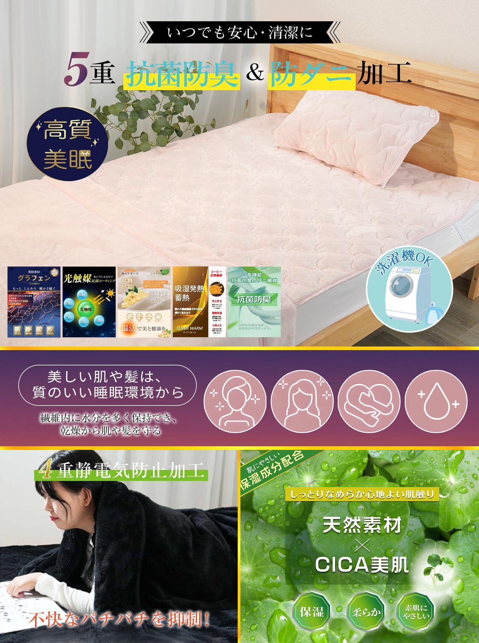 【4重静電気防止×CICA保湿加工で『高質美眠』を実現!】①表生地には導電性繊維が混合されており、静電気によるパチパチ感を軽減させ、ホコリや花粉等が付きにくくなっています。②生地基布に優れた電気伝導性も備えているグラフェン素材を採用。グラフェンを配合した生地は最高レベルの静電気防止性能を実現できます。③放電を促す帯電防止剤を塗布することで、あったか起毛素材に起こりがちなパチパチ感を抑制。④韓国美容でも話題の、肌荒れを防ぐ「天然由来の保湿成分」CICA(ツボクサエキス)を配合することで、繊維内に水分を多く保持でき、保湿効果を高めています。睡眠時の摩擦や乾燥から肌や髪を守り、お肌のケアと良質の睡眠を同時にかなえることができます。洗濯を繰り返しても効果は持続。
