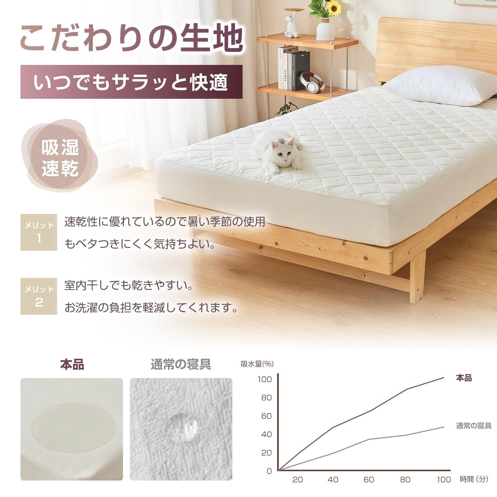 【肌に優しい磨毛素材のシーツパッド】直接肌に触れる部分にこだわった、超柔軟な水洗い磨毛布を使用。吸湿速乾性で寝汗が気になる季節もサラサラの状態を保ち、薄手で軽いから蒸れずに快適です。ベッドパッド一体型なのでずれにくく、シーツパッドとしても敷きパッドとしても使い勝手抜群。