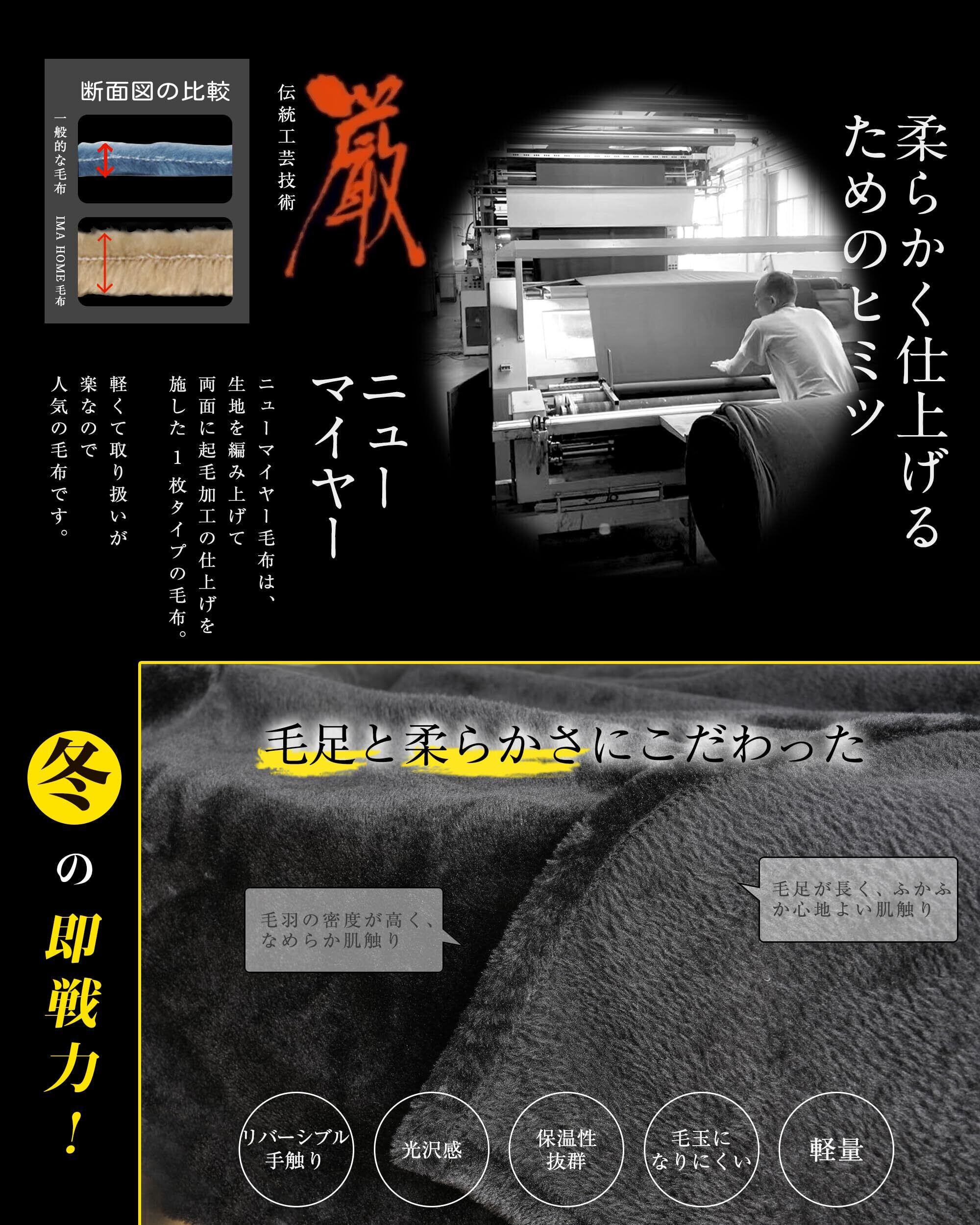 【最新技術×伝統のニューマイヤー毛布】ニューマイヤー毛布は、生地を編み上げ、両面に起毛加工を施した1枚タイプの毛布です。最新の編み技術を用いることで、毛布内に多くの空気を含ませ、含気率を高めることができます。これにより、長い毛足があたたかさをしっかりと保ちます。ニューマイヤー毛布には裏表があり、それぞれで毛羽密度が異なります。他の素材では味わえない、ふんわりとした心地よい手触りを実現しました。一度使えば、その温もりから手放せなくなること間違いなしです!