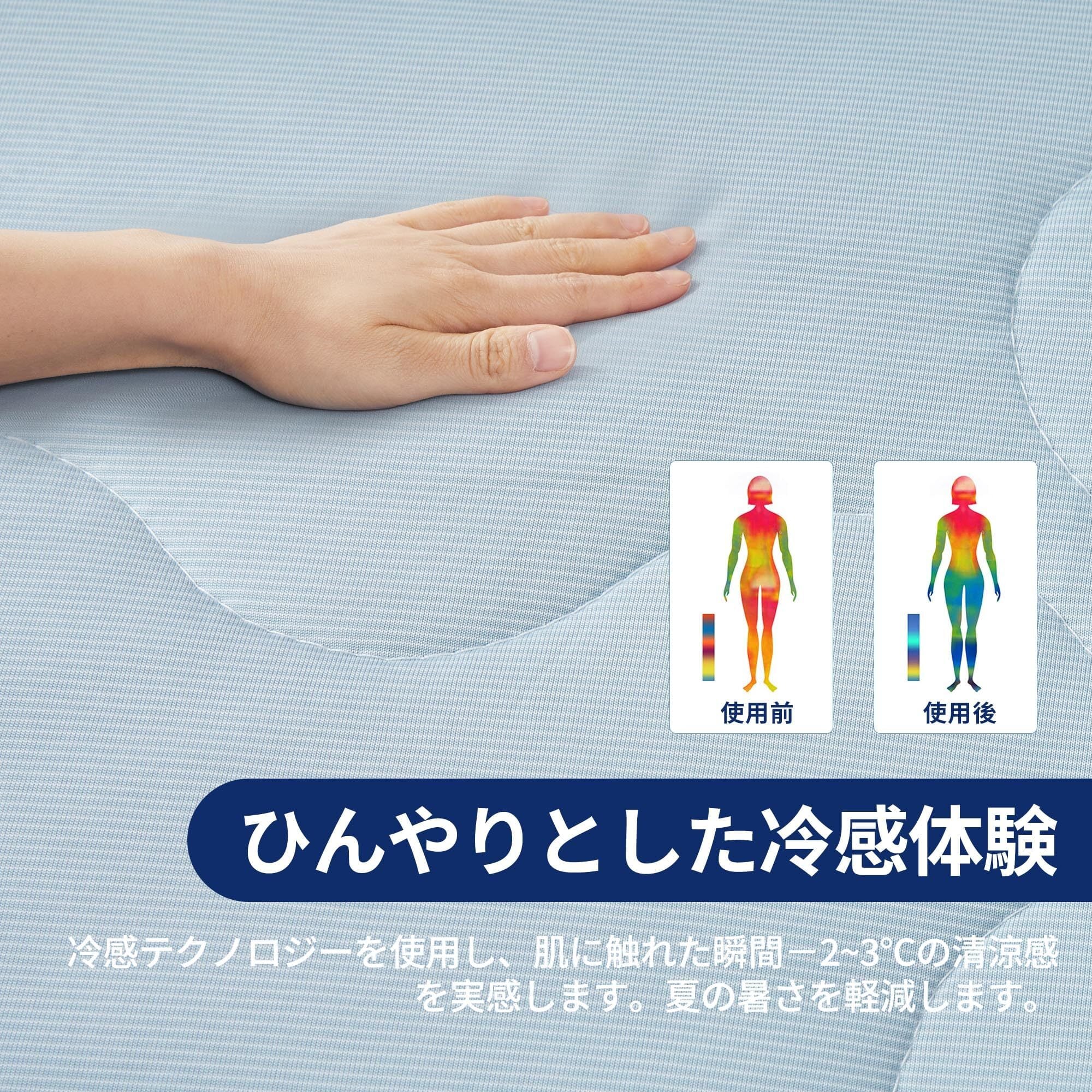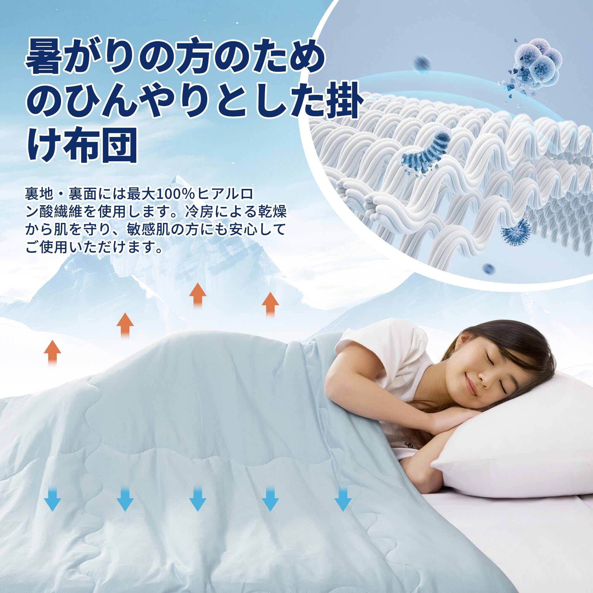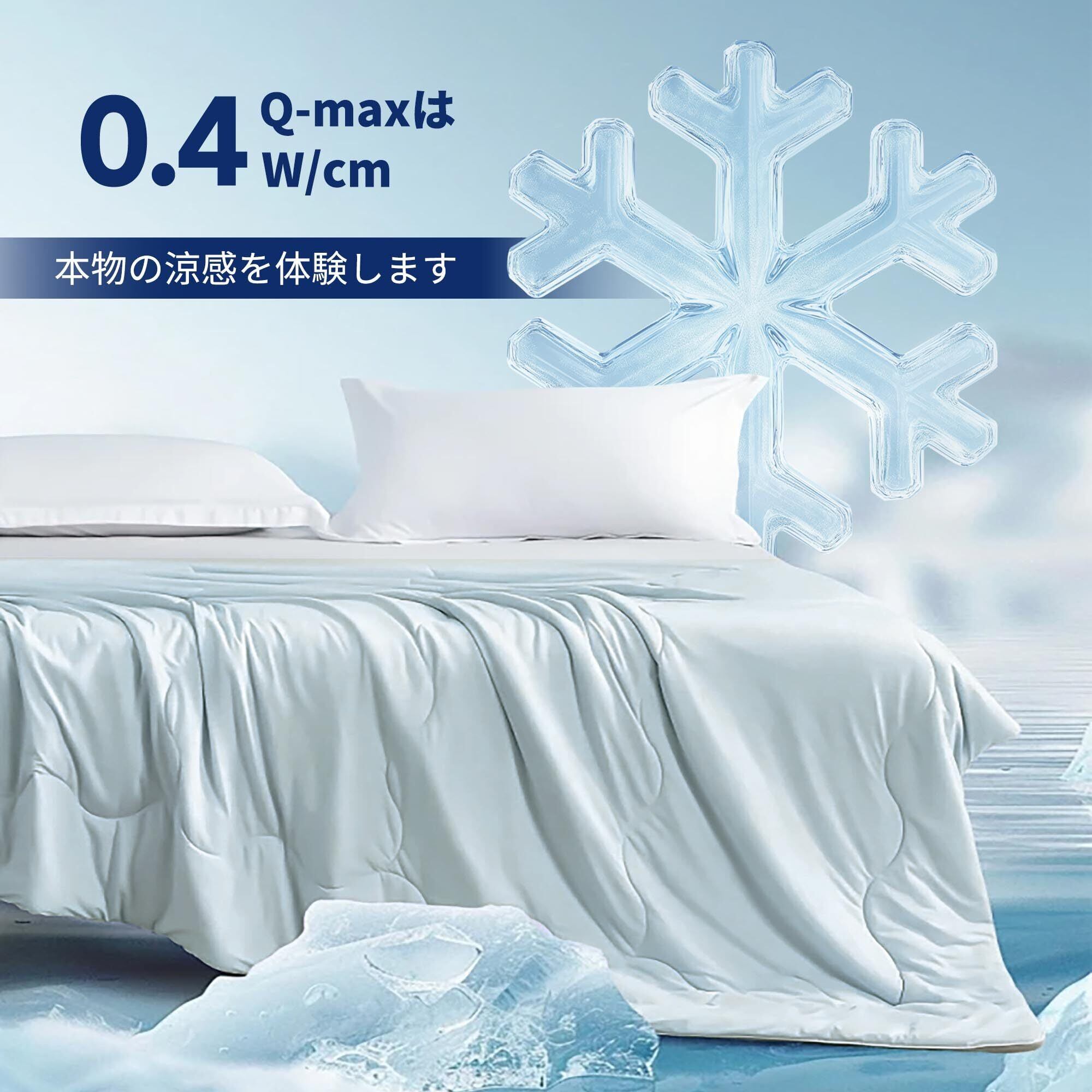 【両面使える&節電対策】 両面使える、季節に合わせて快適に!夏は接触冷感感面を使用通気性がよく、ひんやりします。春秋はワッフル面を使用肌にやさしく心地よいです。Q-maxとは生地に触れた時の冷感は、肌から生地への熱移動によって発生します。Q-maxは数值が高いほどモノに触れた瞬間のひんやり感が大きくなり、0.2W/cmが接触冷感織維の基準となります。当店の掛け布団の Q-maxは0.4W/cmです。エアコンや扇風機と併用で冷感アップ!エアコンは温度を下げすぎなくても涼しくなります。電気代が減り、お財布にも環境にも優しいです。