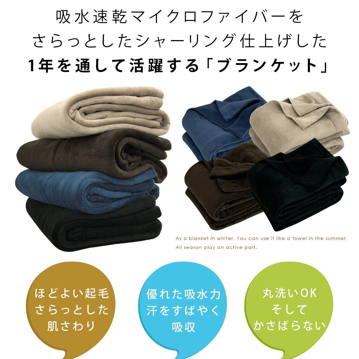 さらっとしたシャーリング仕上げのタオルケット/ブランケット。吸水速乾性に優れたマイクロファイバー素材。軽くてお洗濯などお手入れもらくらく。冬は毛布として、夏はタオルケットのようにオールシーズン使えるケットです。ベッドカバーやソファーカバーなどマルチクロスとして、キャンプでのご使用もおすすめ。汚れが気になったらご家庭の洗濯機で丸洗いできます。