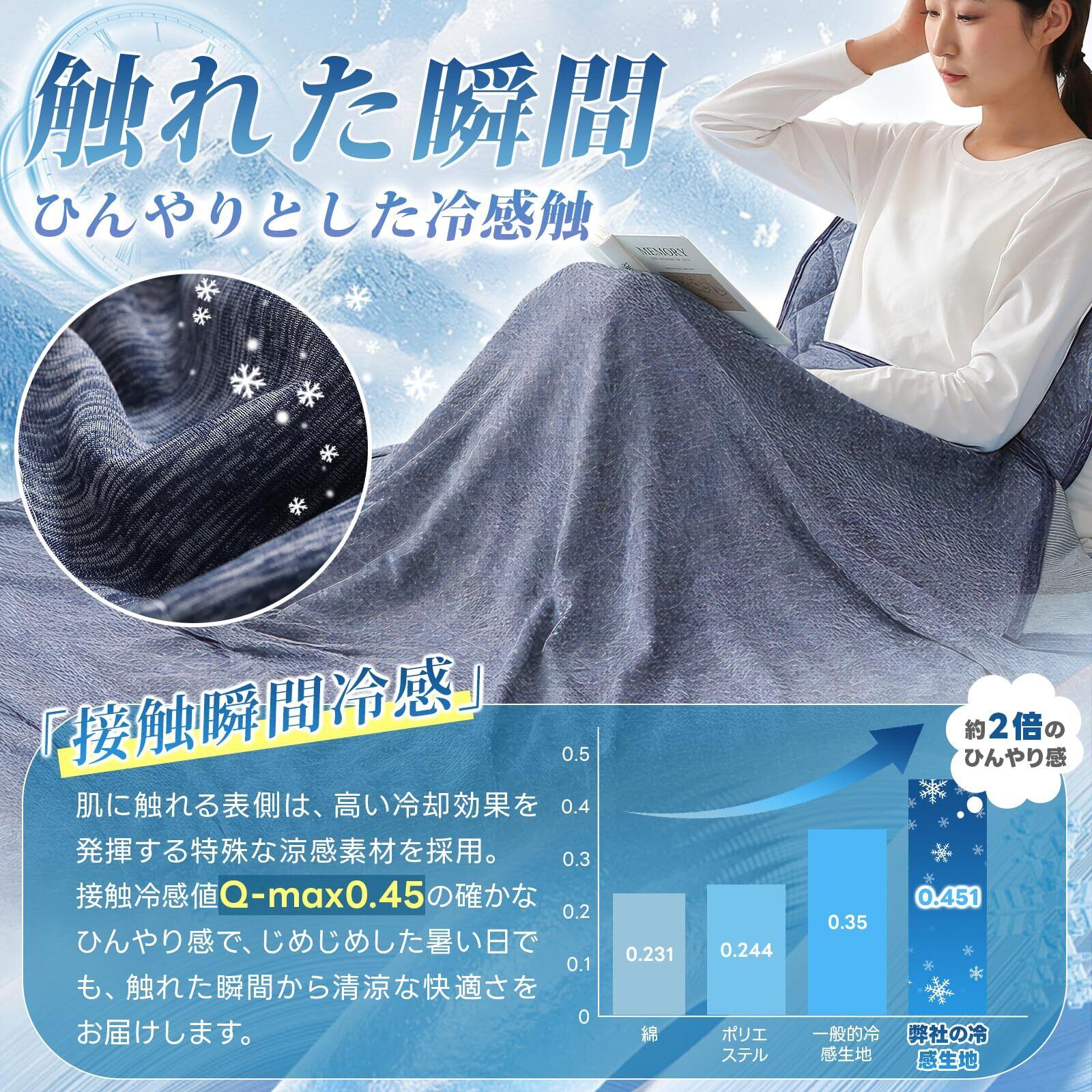 【触れた瞬間、ひんやりタオルケット】Qmax値0.45の高冷感素材が、触れた瞬間心地よいひんやり感が伝わり、夏の必須アイテムとして、エアコンや扇風機との併用でさらに冷却効果がアップ。暑い夜でもぐっすり眠れる、快適な睡眠環境をサポートします。