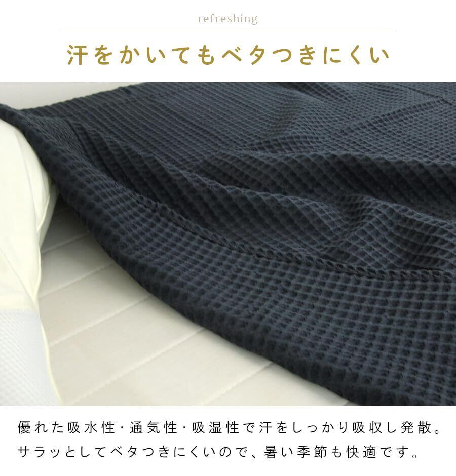 吸水性に優れ、やわらかで軽やかな気持ちよさが続くタオルケット。空気をまとうように身体に馴染むワッフル生地。