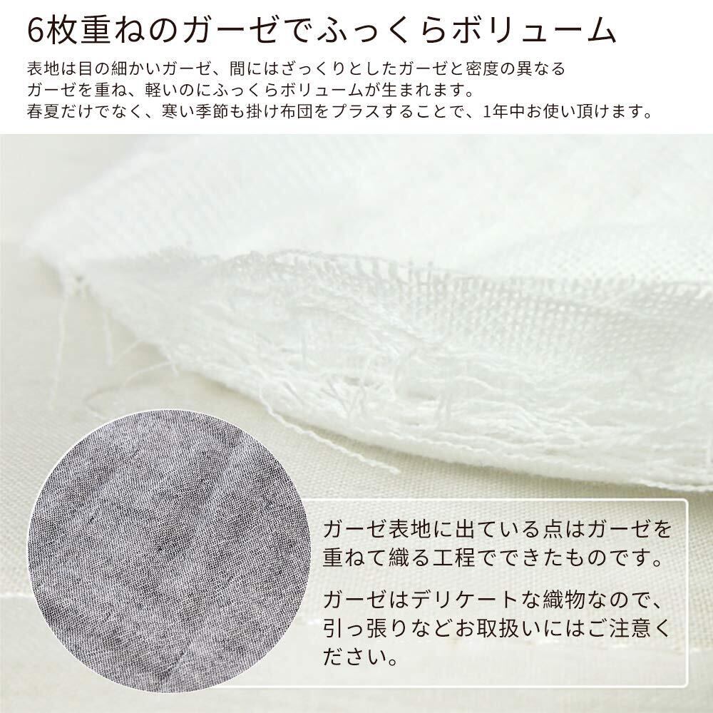 【6枚重ねのガーゼでふっくらボリューム】贅沢なボリュームと、とろけるような肌触りに包まれるガーゼです。6層に重ね織られたガーゼがたっぷりと空気を含み、ふかふかのボリュームと柔らかさを感じられます。 表地は目の細かいガーゼ、間にはざっくりとしたガーゼと密度の異なるガーゼを重ね、軽いのにふっくらボリュームが生まれます。春夏だけでなく、寒い季節も掛け布団をプラスすることで、1年中お使い頂けます。