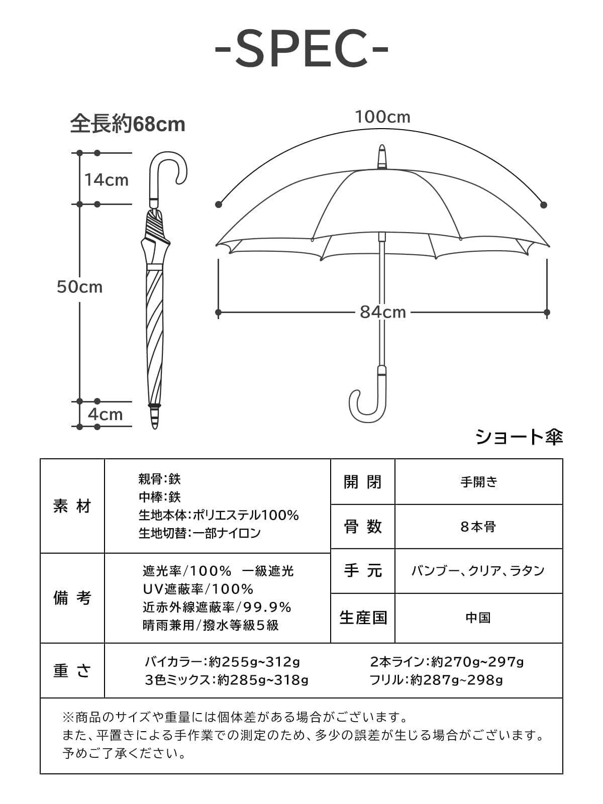 【軽量で使いやすい・素材感のあるバンブー手元】バイカラー、3色切替、フリルと2本ラインデザインを28色展開。スリム型で軽量のショート傘なので、持ち歩きやすいし、道で人とすれ違うとき邪魔になりにくいです。毎日の携帯にも負担になりません!また、ハンドルには高級感漂うバンブーを使用しております。個性的で美しく、水に濡れても変形しずらい、丈夫で汚れがつきにくい特徴があります。見た目の高級感だけではなく、しっかりと手にフィットする曲がり手元です。透明感のある美しいクリア手元と素材感と質感のあるラタン手元も用意しました。ライフスタイルやファッションに合わせてお選びください。全長約69cm、親骨50cm、直径約87cm、重さは約285g-318gです。
