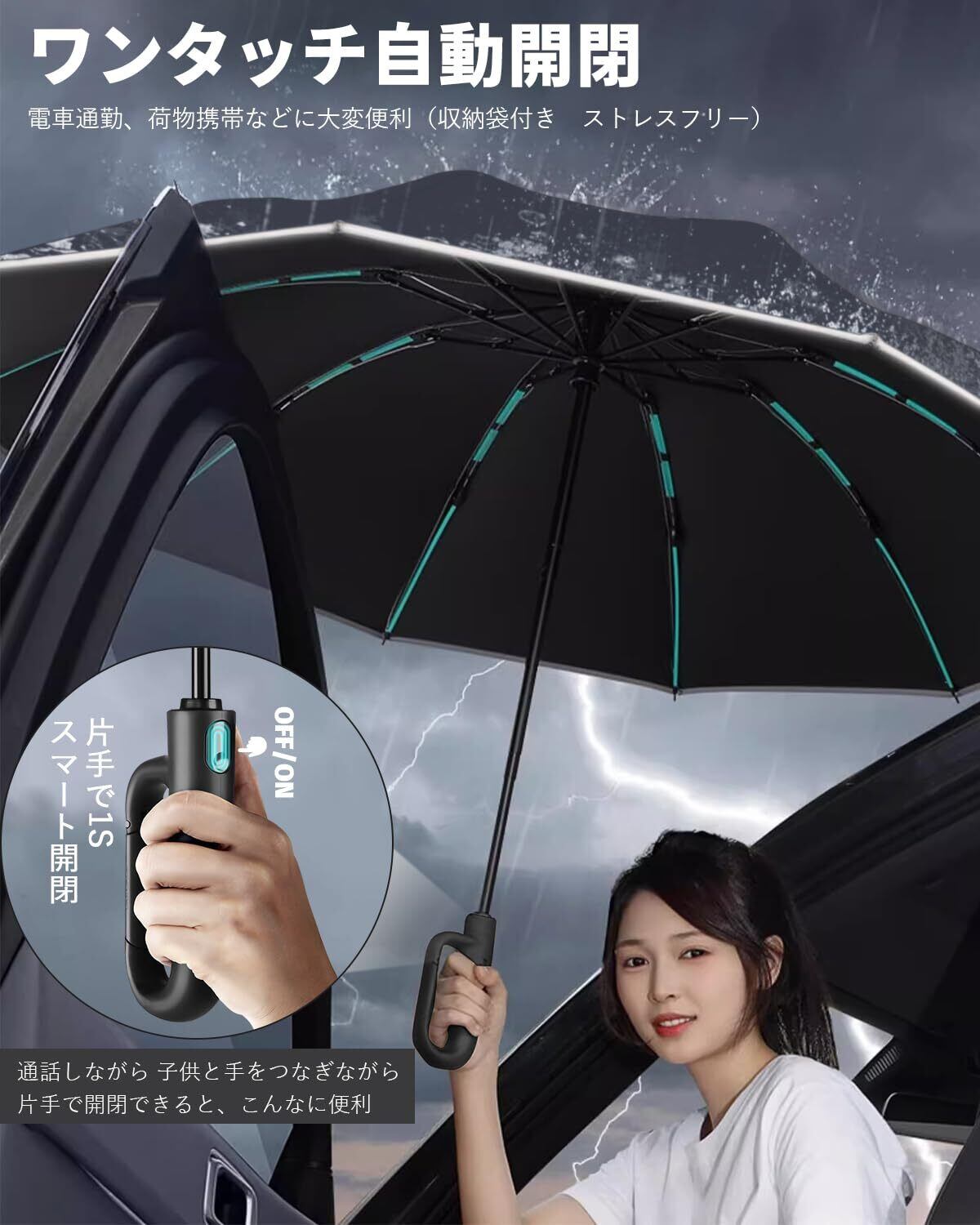 【片手で簡単操作!便利な自動開閉式傘】おりたたみ傘は、自動開閉の構造設計を採用しています。傘は小さな力で簡単に開閉でき、両手に荷物を持っていたり、車の乗り降りをする際、子供を抱いているとき、あるいは両手が荷物でいっぱいのときでも、ワンタッチで操作できます。機能的なだけでなく、デザインも優れています。さらに、折りたたみ式なので、常にバッグに入れて持ち運びやすく、車に予備として保管するのにも便利です。