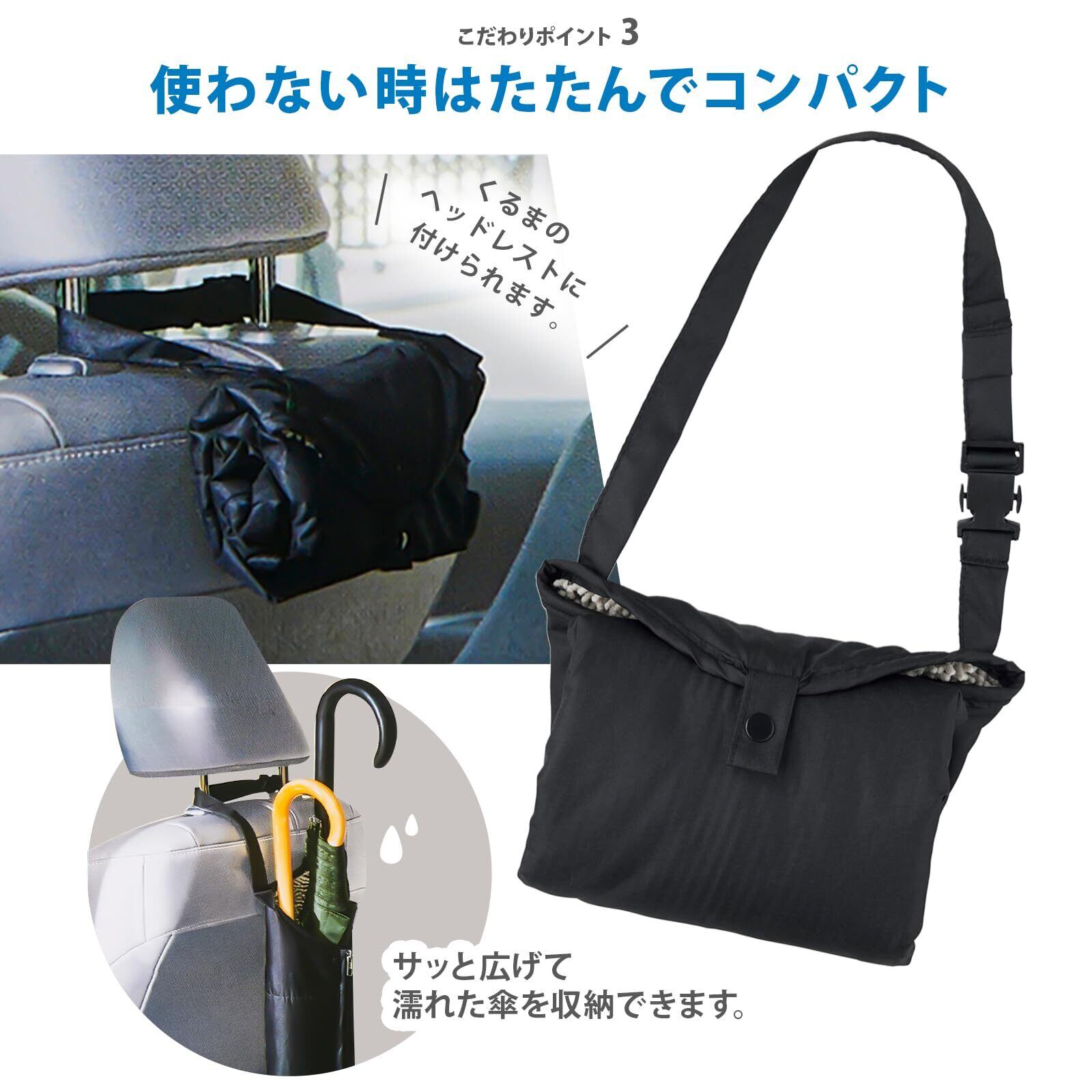 ケースの内側·上部·底面に吸水モールを採用。雨の雫をしっかり吸水します。車の中を濡らすことなく、収納することができます。車のヘッドレストに掛けることができます。使用しない場合は、丸めて畳むことでコンパクトに収納することができます。