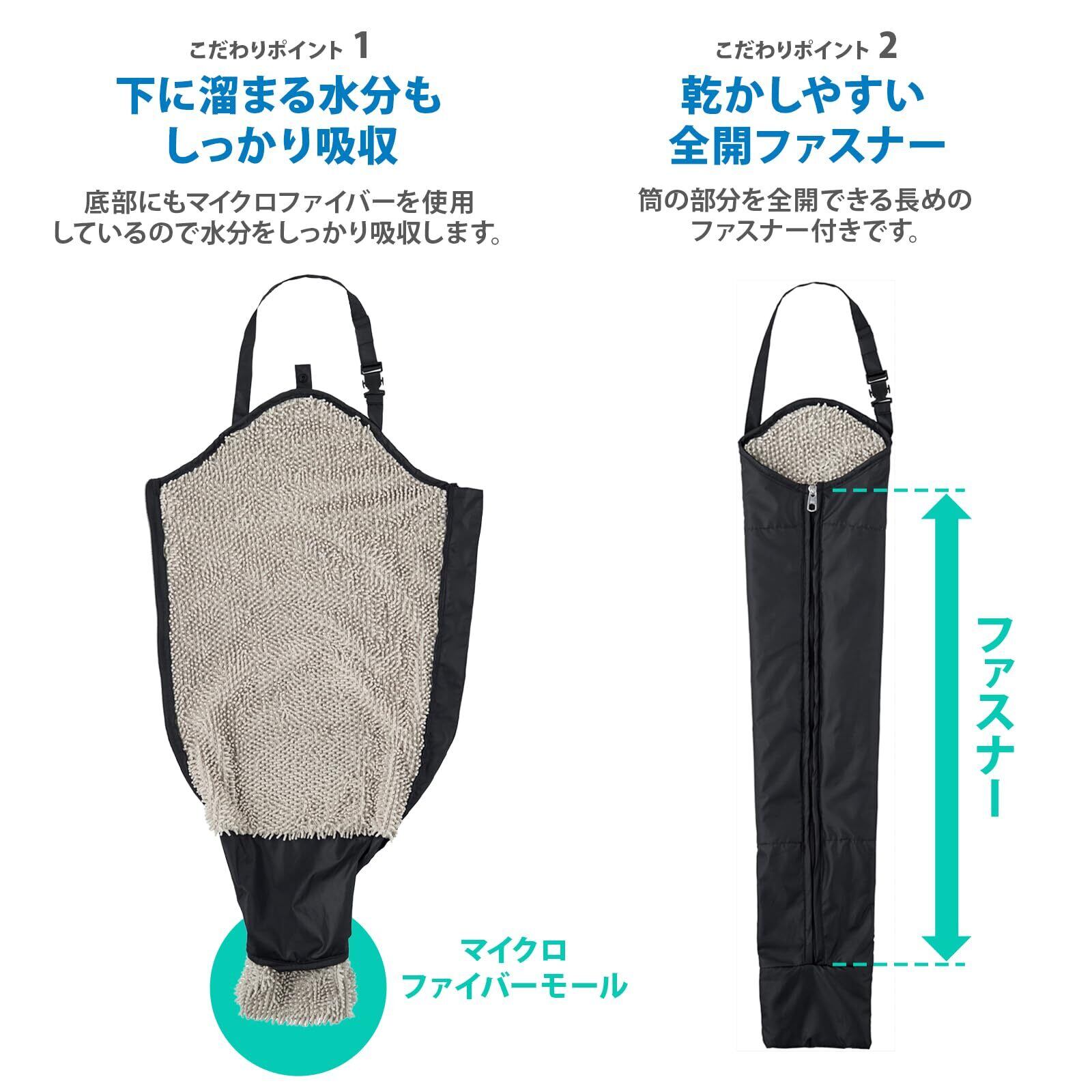 を取得している、吸水性抜群のマイクロファイバーモールで、濡れた傘の水滴をしっかり吸水する傘ケース 長傘用