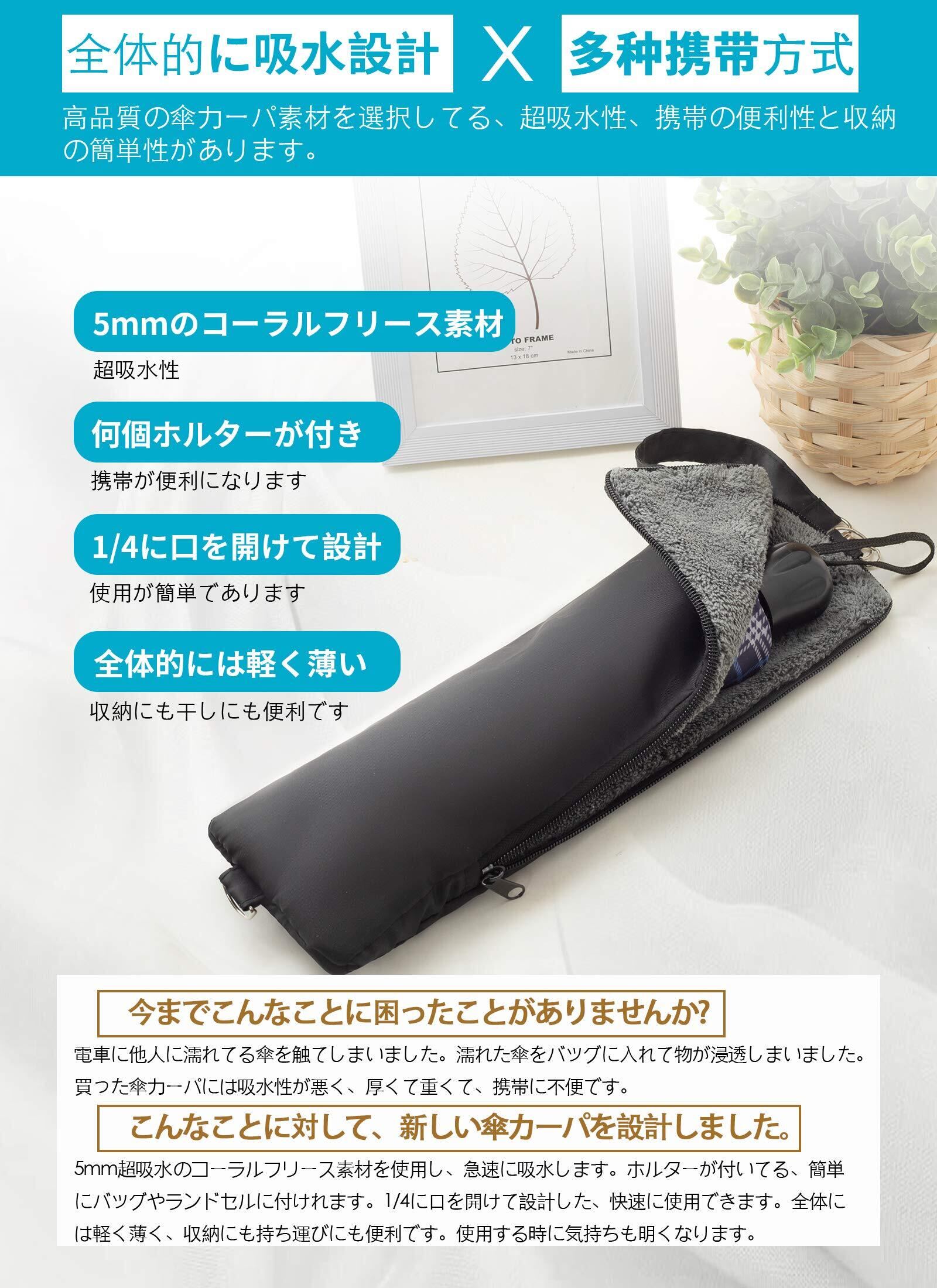 【携帯便利】傘カーパには長く使えるホルター付いています。もし濡れた傘を折りたたんでカバンに入れたくないなら、カバンや、オフィス、車内、電車やバスに傘カーパを水平又は垂直に掛けられます。携帯にも便利です。いろいろな場所、様々な場合に使えるので、とても便利です。