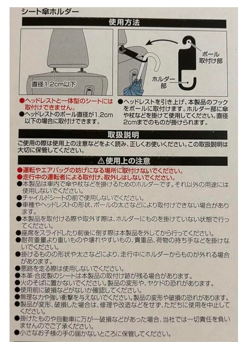 ヘッドレストに簡単取り付け!シート傘ホルダー 傘の柄杖など 直径2cm用 耐荷重1kg 1個