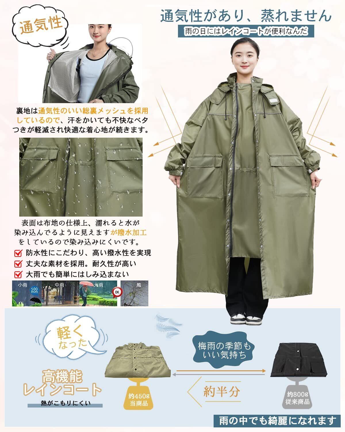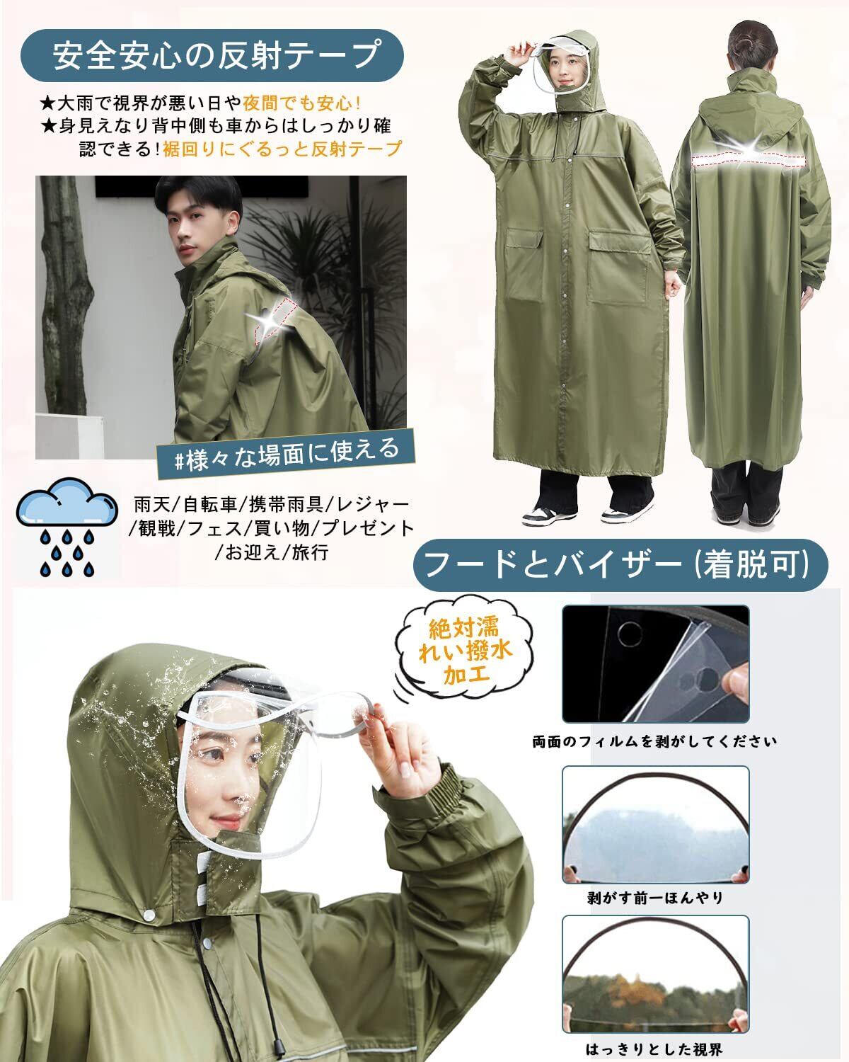 【2026新型・おしゃれ構造軽量で蒸れないメッシュ付きレインコート レディース】急な悪天候の時にもすぐにご利用いただけるファスナー&シール式のを採用しています。安心で便利に、着脱ぎしやすいアイテム。市場のレインコートと違って、弊店のレインコートは高品質のポリエステル素材を使用し、長年ご利用いただけます。自転車 原付におすすめ!リュックを背負ったまま着れる!雨の日でも安心安全な機能がもりたくさん:①裏地にはメッシュ設計を使用しなって、真夏や梅雨などの天気での長時間着用にもベタつきなし!②嬉しいフェイスカバー付き!③フードにはサイズを調節可能なマジックタイプ仕様:頭のサイズに合わせて調整可能。また雨水の侵入も防止します。④前身頃に大きめなポケツトを2個デザインで、ちょっとした小物や折りたたみ傘の収納にも便利。⑤後ろ身頃には3角形のマチ付きデザインを使用し、リュックを背負ったままでも自転車をこいいただけます。そして夜間外出にも安全な反射ラインがついております。⑥フードは取り外しが容易なスナップボタンを採用しており、必要に応じて取り付け&取り外しが可能。