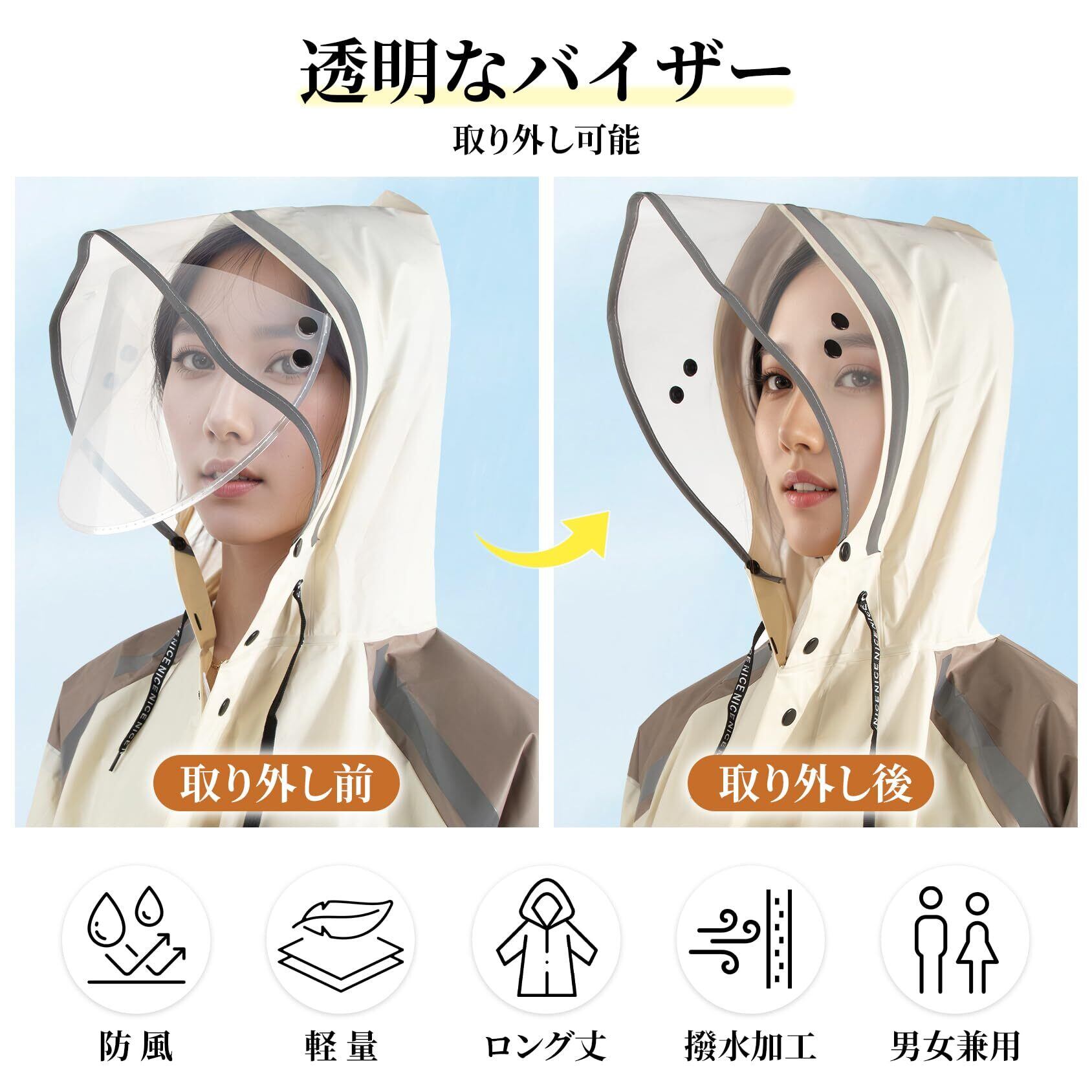 【二重バイザーで視界確保】 着脱可能な透明バイザー付きで、雨の日も視界良好。自転車運転時も安心です。袖付きデザインで両手が自由に使え、ハンドル操作もスムーズ。ポンチョながら袖があるから便利です。