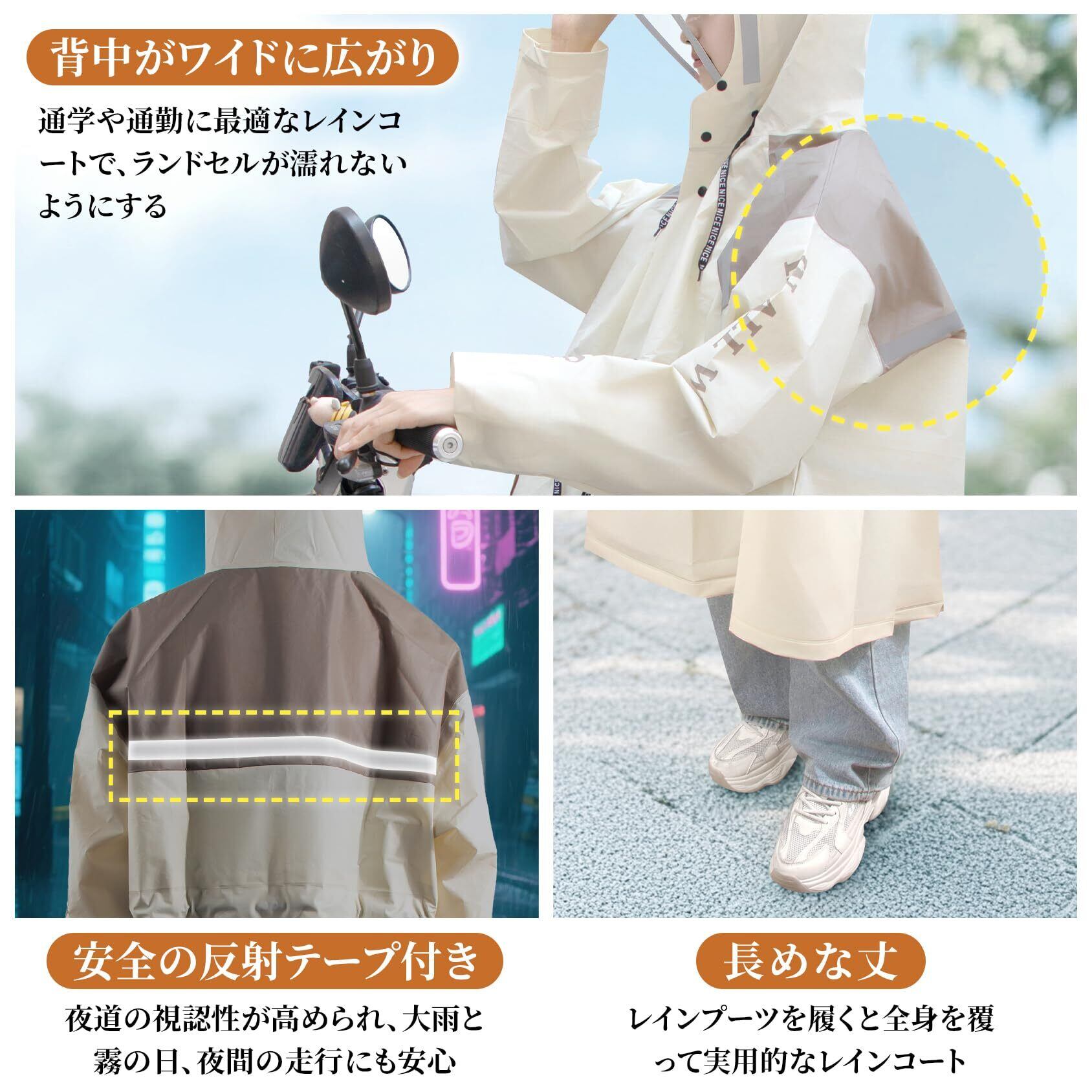 【安全機能&収納便利】 背面反射テープで夜間の視認性向上。両サイドに防水ポケットを装備(スマホ収納可)。ゴム袖口で雨水の侵入を完全ブロック。雨の日のお出かけを快適で安全にサポートします。