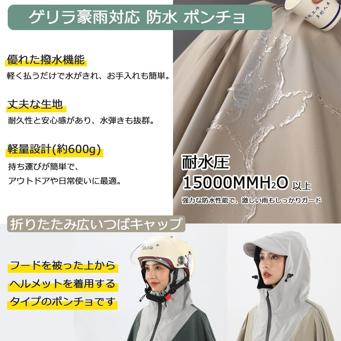 【着脱が簡単で、忙しい日もストレスフリー】ケープデザインで、頭からかぶるだけで簡単に着用可能。ボタンやジッパーが不要なので、雨の朝や子供の送迎で急いでいる時でも楽に着られます。素材:外側はポリエステル(内側:TPUラミネート)、透明窓はPVC、バックルはPBT樹脂で、軽量で耐久性があります。