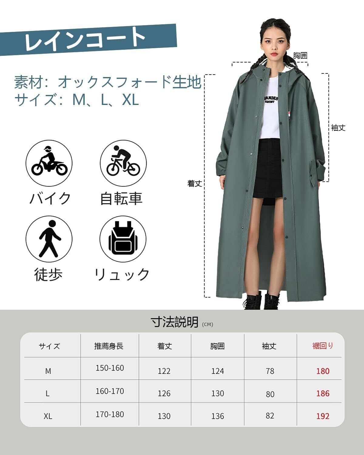 【雨の日にも安心・安全】1. ベルクロ式フードでサイズ調整可能、頭囲に合わせて調整できます。2. 前面に2つの大型ポケット付きで、小物の収納や折りたたみ傘の収納に便利です。3. 快適な伸縮性のある袖口、袖の長さを調整可能。4. 男性用・女性用ロングレインコート。長い丈で足を完全に覆い、濡れるのを防ぎます。5. ポンチョデザインでバックパック収納スペース付き、学生やビジネスパーソンに最適です。