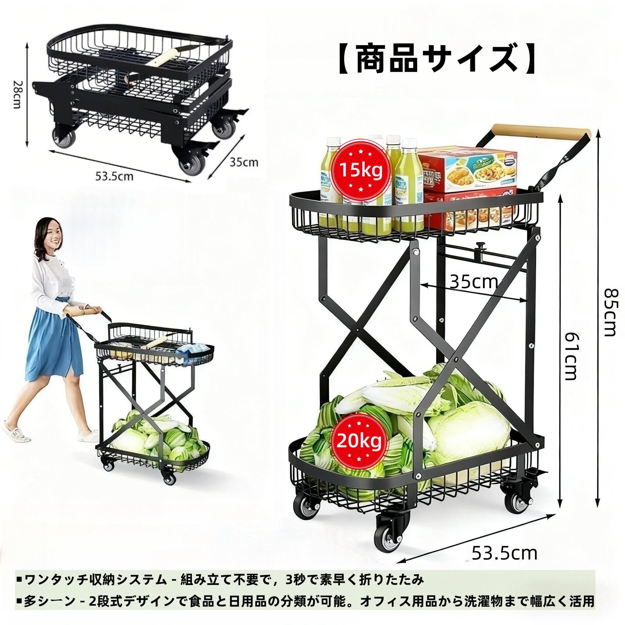 【特価商品】キッチンワゴン ショッピングカート 折り畳み 大容量 収納力 キッチンワゴン キャリーカー ト 2段 収納ワゴン 耐荷重が強い 多機能ショッピングキャリー 360°静音キャスター 3インチのホイール キッチン オフィス 日用品 工具収納 物流運搬 ピクニックバーベキュー スーパーでの買い物 組立不要 トランクに収納可能