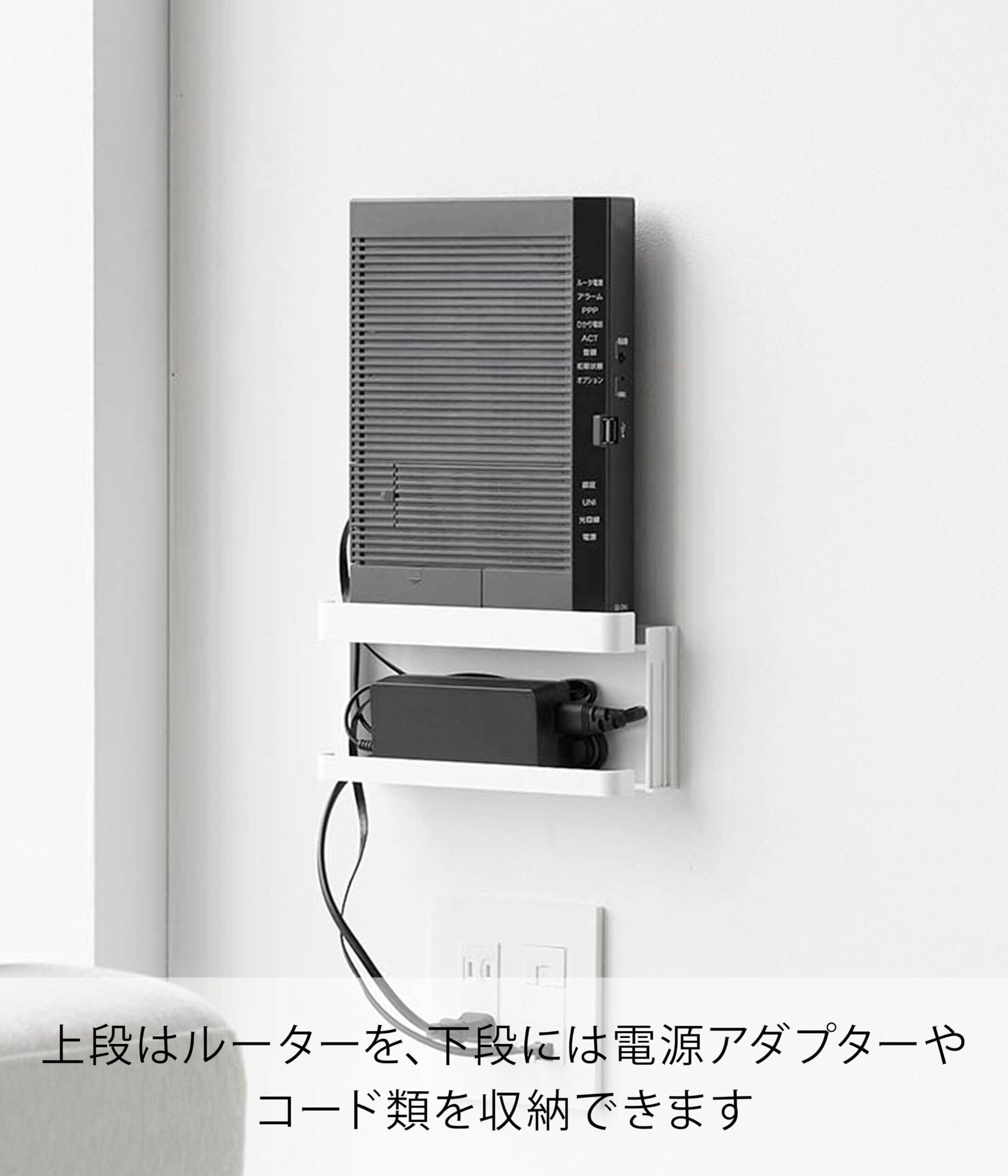 様々なルーターに対応しており、下段には電源アダプターやコード類を収納することができます。